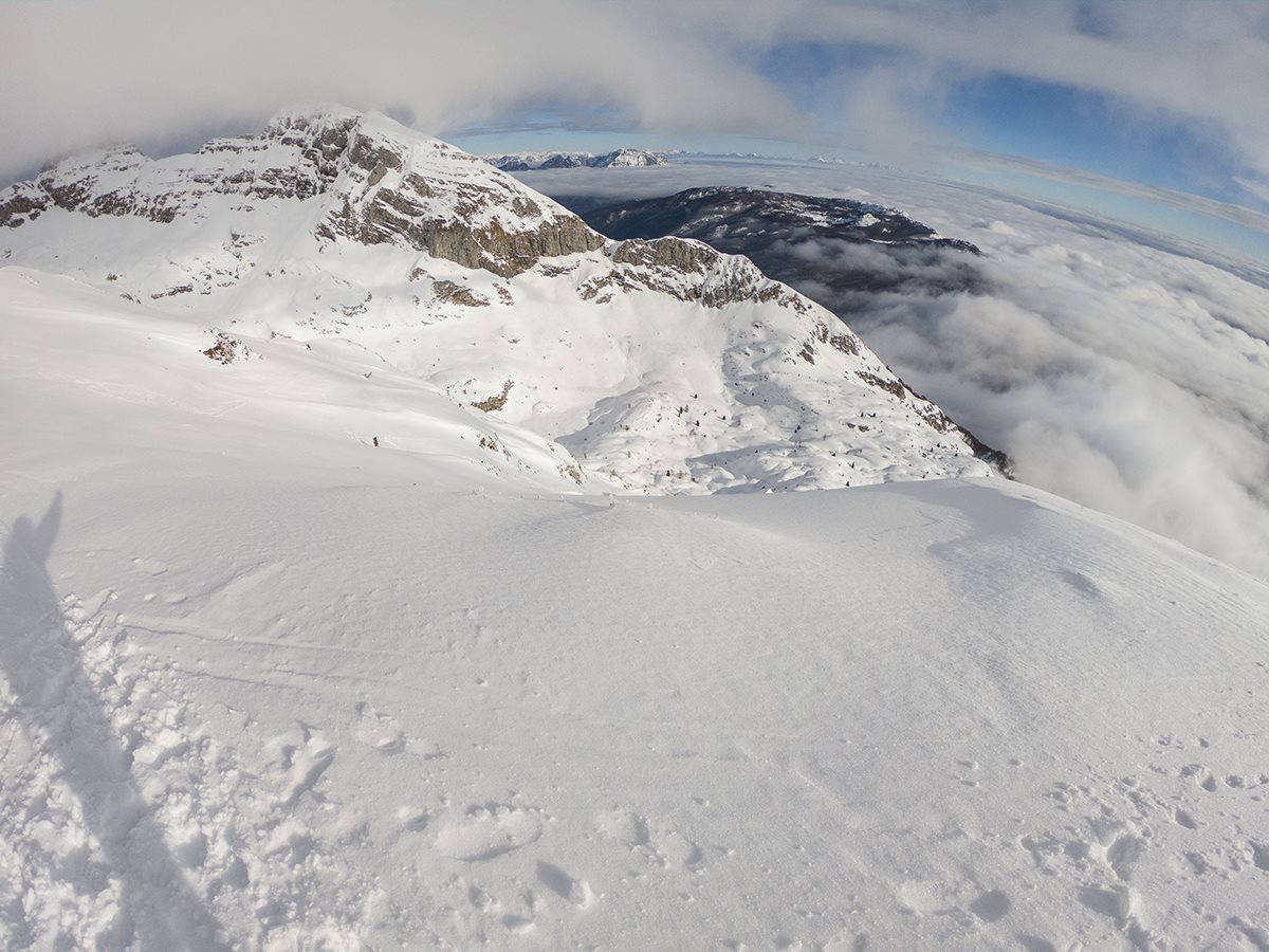 Sarebbe bello percorrere le creste dell'Alta Via dei Rondoi ma i cumuli di neve sono abbondanti e la nebbia scende fitta.