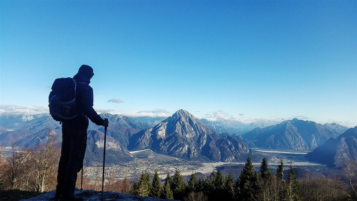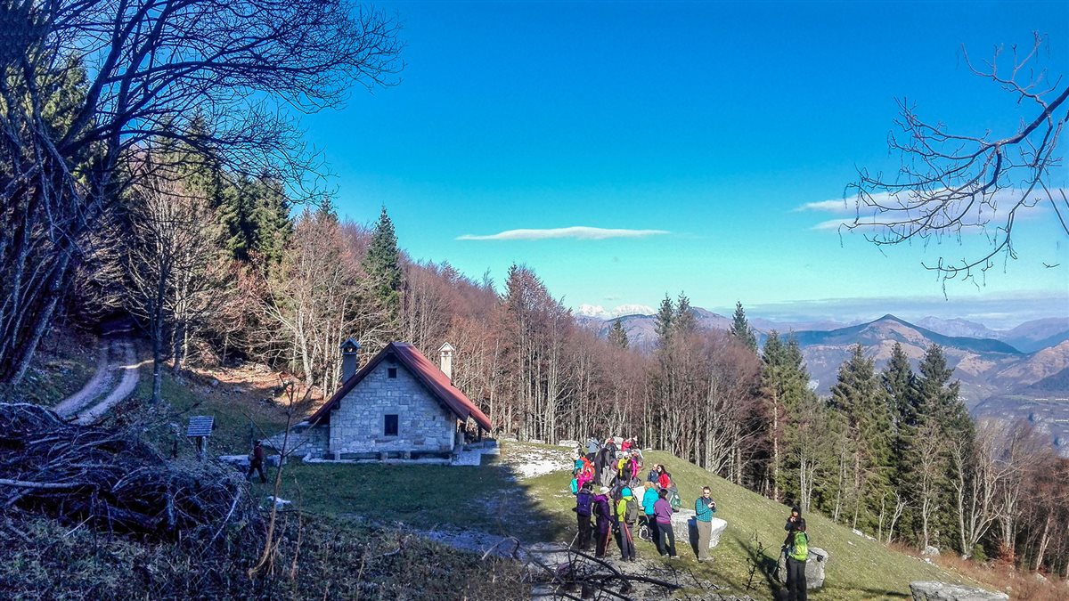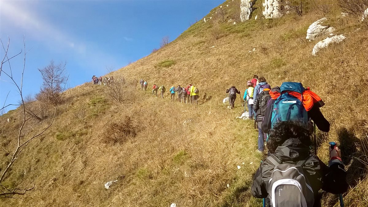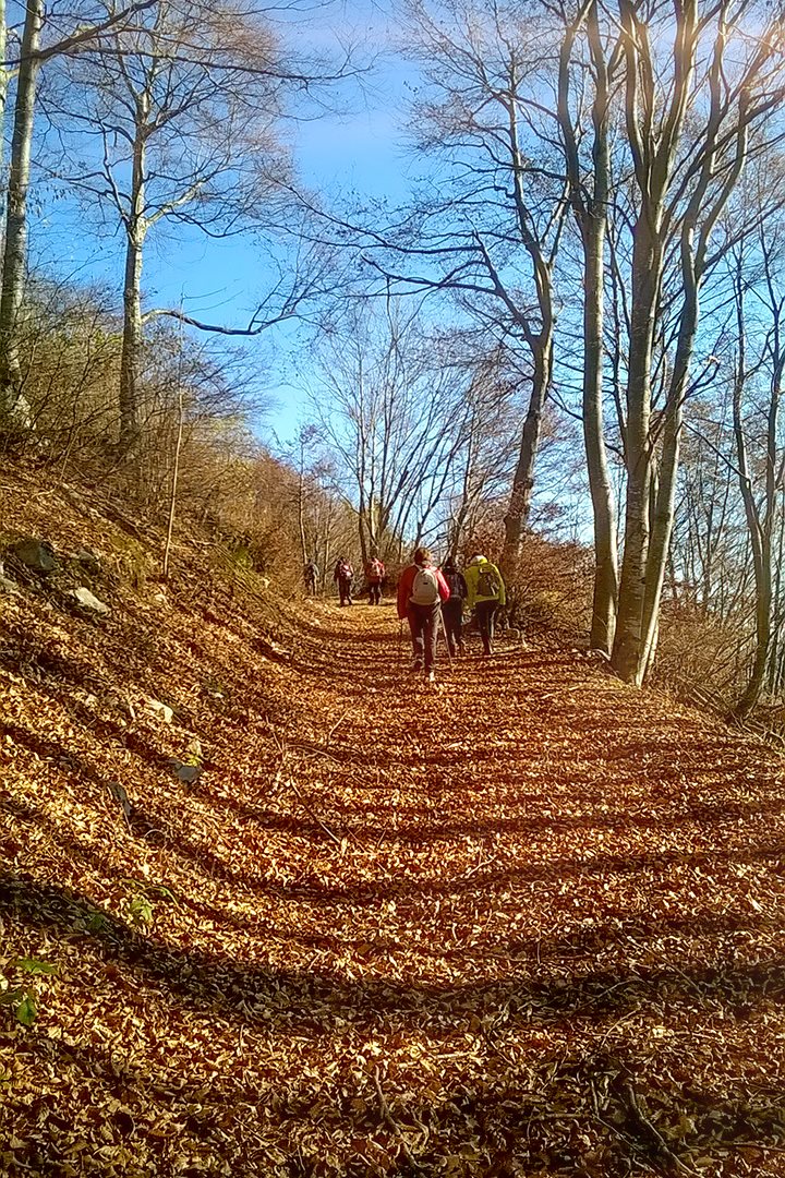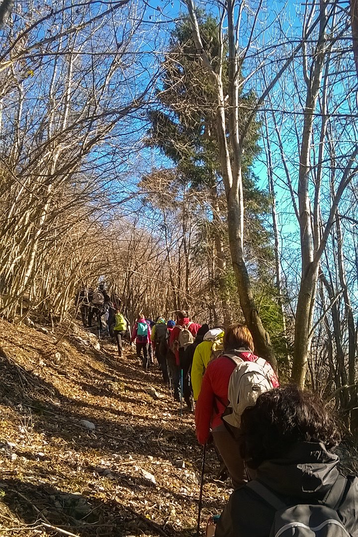 Di qui imbocchiamo il sentiero Cai n.809: all'inizio percorriamo uno sterrato nel bosco per poi abbandonarlo e iniziare un sentiero panoramico. Dopo una prima parte di rettilineo, il sentiero dapprima scende leggermente e poi inizia pian piano a salire, diventando a tratti molto stretto e particolarmente esposto in 3 tornanti. È qui che infatti il gruppo comincia a rallentare, principalmente per due ragioni: alcuni per cautela ed un leggero senso di vertigine – stando ben attenti a dove poggiare i piedi – altri per scattare fotografie, considerata la vista davvero particolare sulla conca tolmezzina e il lago di Verzegnis, sovrastati dall’Amariana ed il Canin.