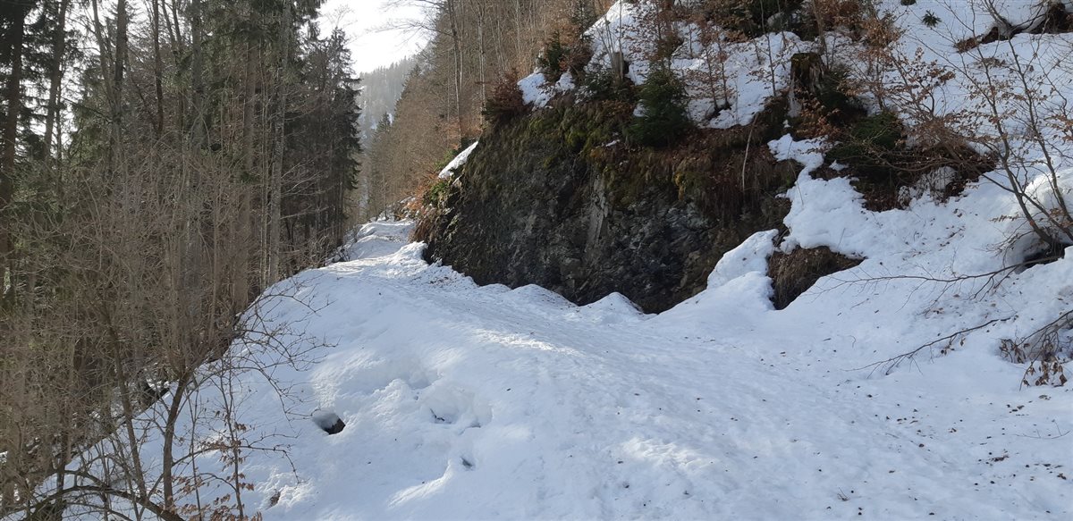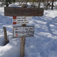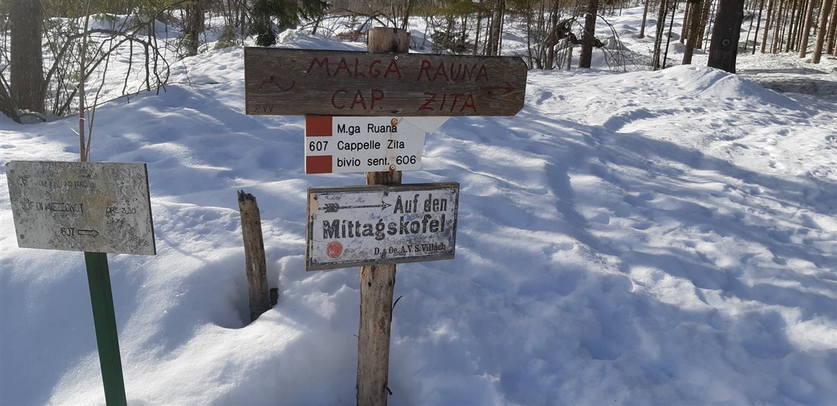 L’aria di primo mattino è ancora frizzante, il cielo è terso, il sole fa capolino illuminando le vette dei monti circostanti. Sono a Valbruna: appena fuori del paese verso l'interno della valle, pronto per iniziare l'escursione verso la Cappella Zita/Malga Rauna e da qui che si prende il tracciato del sentiero CAI n. 607 per raggiungerla si tratta di un'escursione facile che sale gradualmente fino a raggiungere i 1515 metri. La neve scesa copiosa nei giorni scorsi si mantiene intatta o quasi lungo il sentiero poche le tracce del passaggio di uomini o animali anche se il tepore che si preannuncia per la giornata dà al paesaggio la sensazione di procedere verso un lento ritorno ai colori del bosco misto di faggi e abeti.