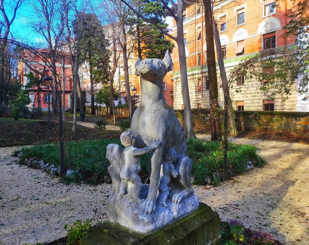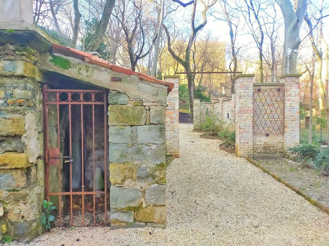 Percorrendo i sentierini, fino all’ampio spazio aperto nella parte più bassa, si nota subito una statua, un grande levriero con due putti. Pochi metri dopo l’ingresso, che si trova su via Navali 9, c’è una piccola casetta, che veniva usata per conservare bevande e cibo al fresco.