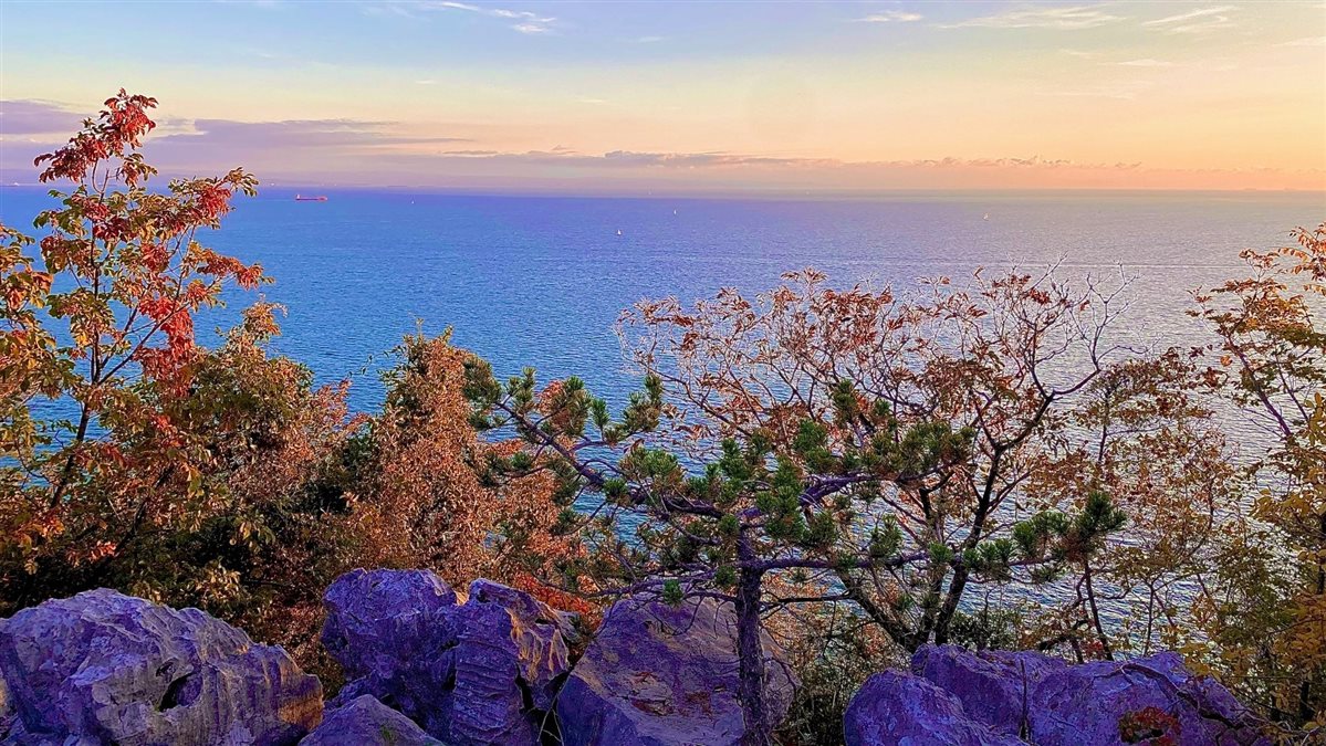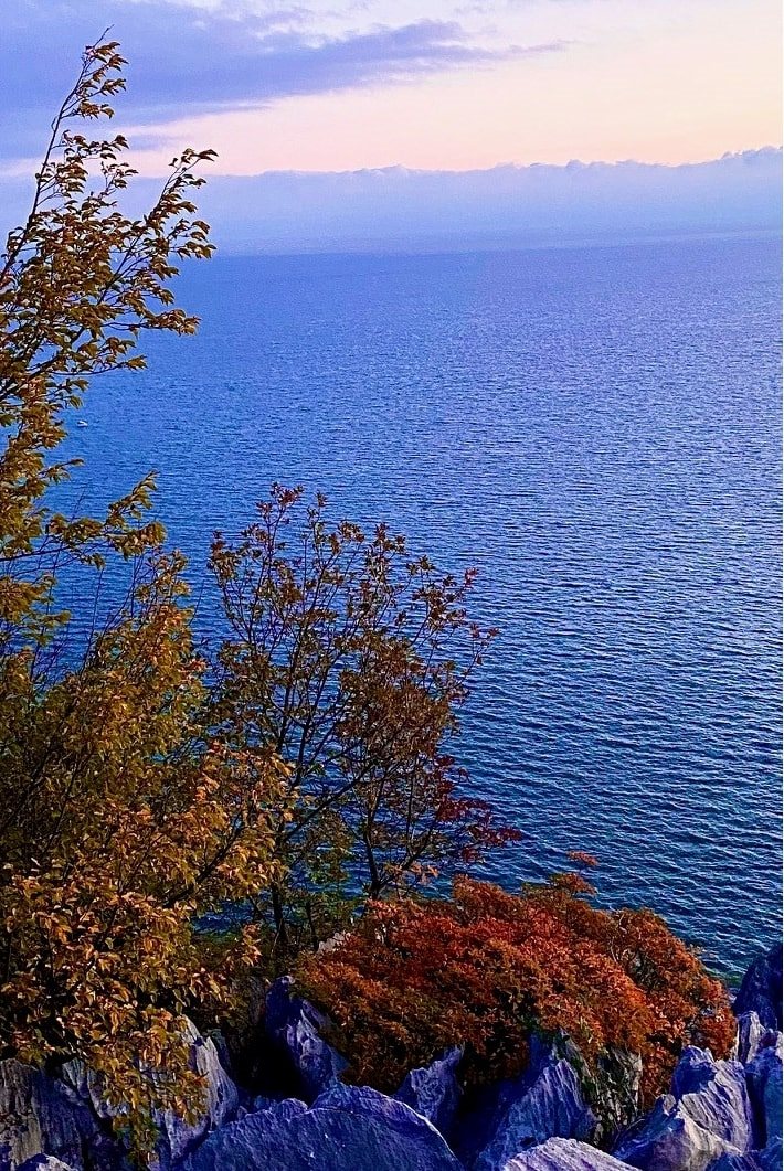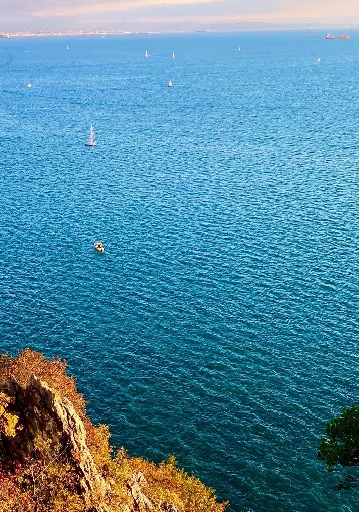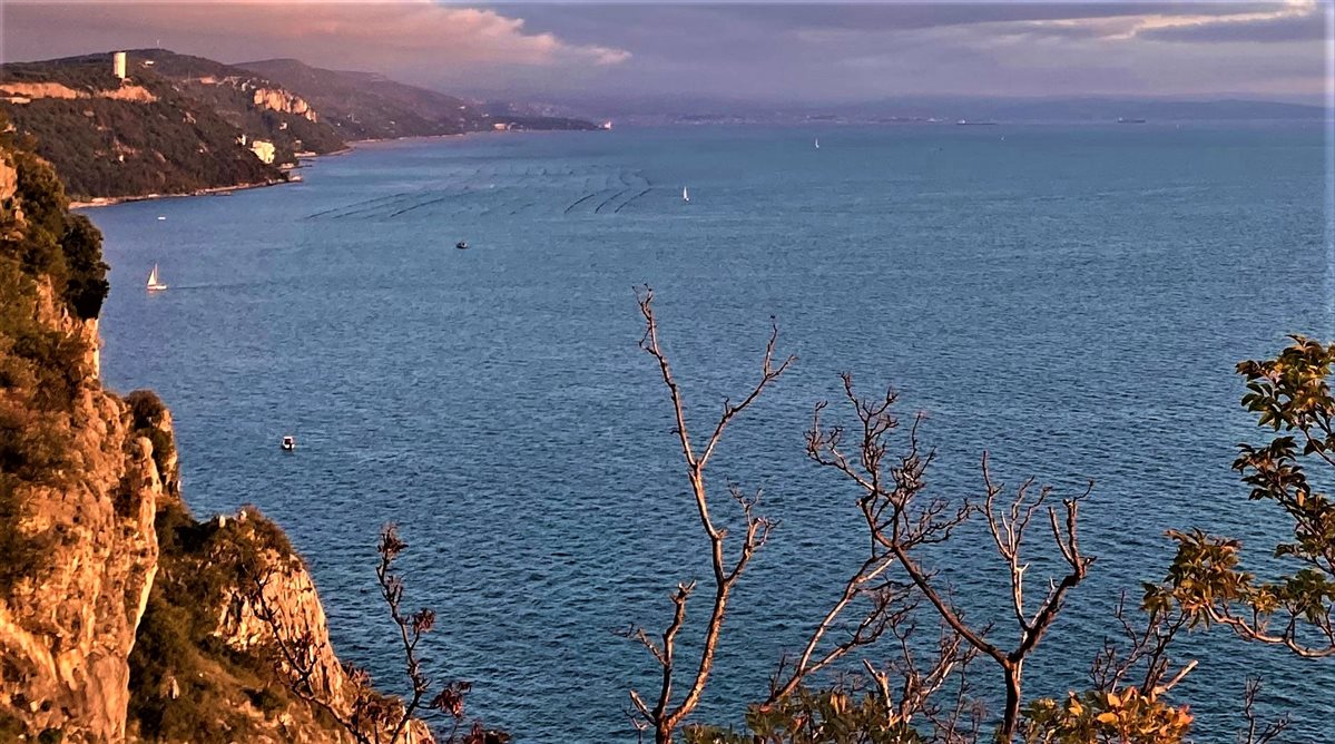 I colori intensi hanno ispirato anche le mie foto durante questa passeggiata autunnale al tramonto. Dal sentiero si può godere di una vista meravigliosa sulle falesie, il sole che tramonta all’orizzonte e, in fondo alla baia, le prime luci che si accendono in una nebulosa Trieste.