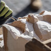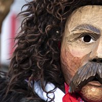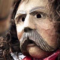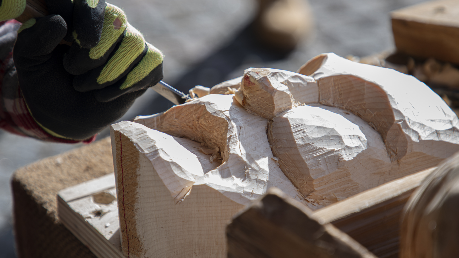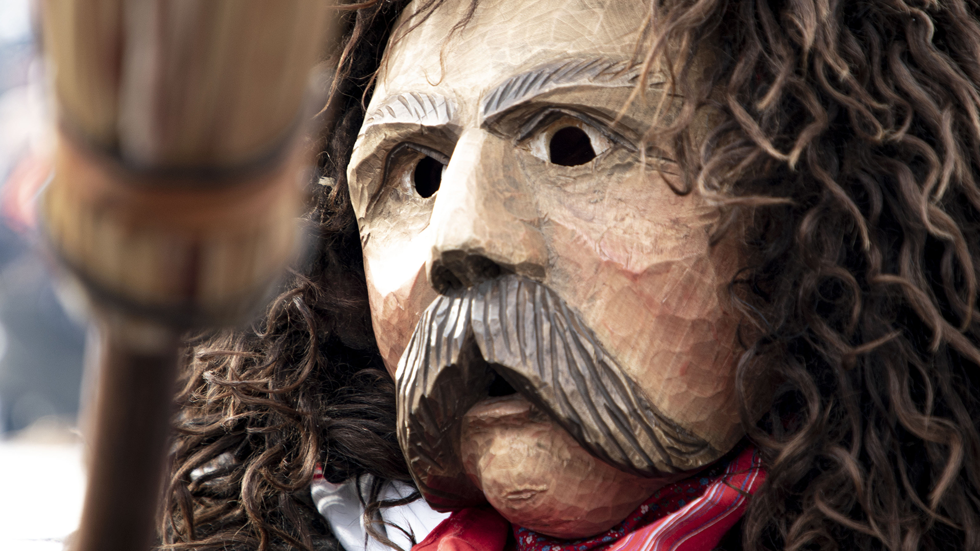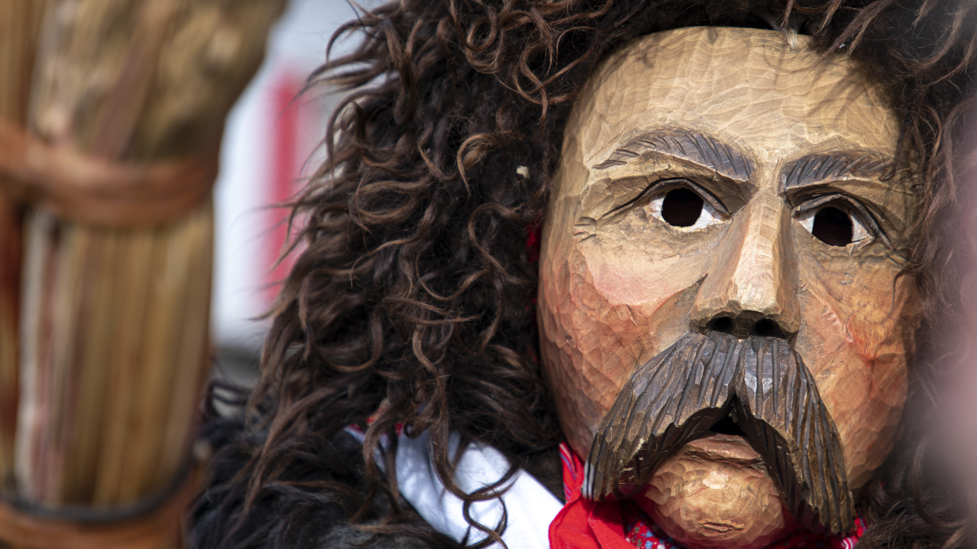 La maschera che copre il volto nasce a mano dall'intaglio di un blocco di cirmolo, legno morbido che permette di scolpire i dettagli, anche quelli più piccoli, con precisione.