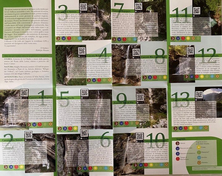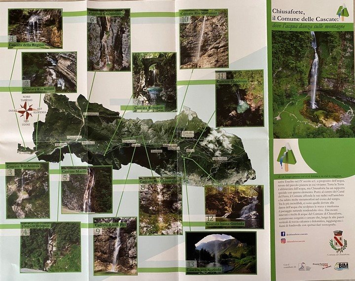 Il “Sentiero delle cascate” si sviluppa in angoli suggestivi del comune di Chiusaforte; la maggior parte delle cascate si trova nelle vicinanze della strada che porta a Sella Nevea, alcune di esse invece si trovano in prossimità della strada statale (Roveredo, Villanova e Casasola).  Il Comune di Chiusaforte ha pubblicato un dépliant nel quale vengono descritte tutte e 13 le cascate, dalle più famose come la cascata Goriuda, Repepeit o Cadramazzo fino a quelle più nascoste nelle frazioni interne del paese. Oltre alla mappa di dove si trovano le cascate, vengono indicati anche i tempi di percorrenza, la stagione adatta per visitarle e le altezze delle cascate; i percorsi sono semplici e di breve durata il che fa assaporare tutta la forza della natura della Regione Friuli Venezia Giulia.