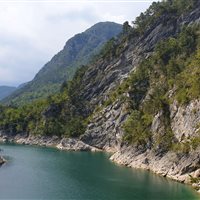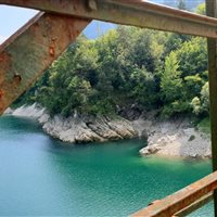 Muinta si può raggiungere solo a piedi, quindi parcheggiamo l’auto e ci avventuriamo sul sentiero che scende verso il lago e che ci porta a quello che gli abitanti del luogo chiamano “il ponte traballante”.