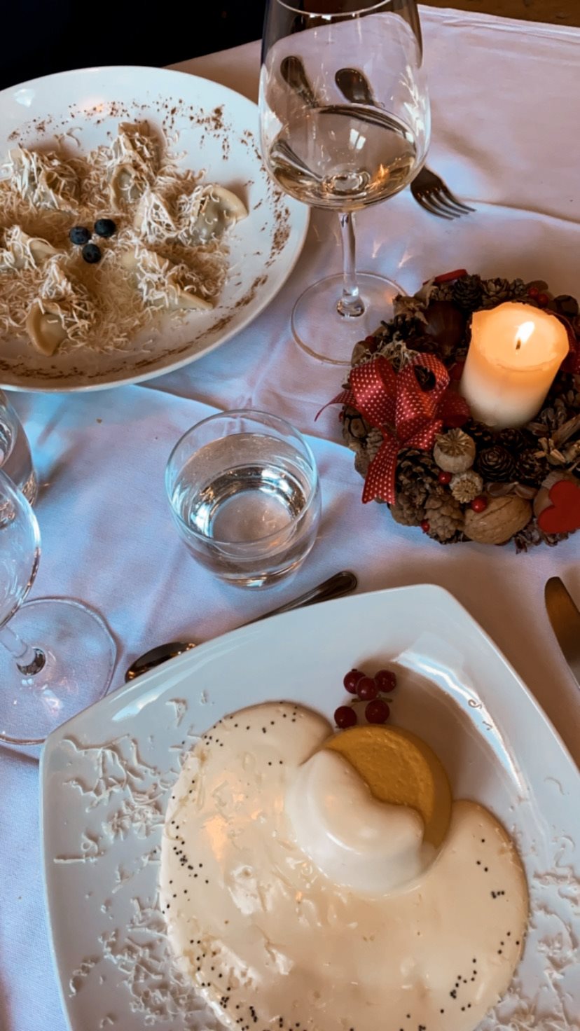 Una volta entrati si viene accolti da un piacevole calore e profumo di legno unito a quello di indescrivibili prelibatezze culinarie, i suoi interni sono interamente arredati di legno e pietra a vista, dalle sue finestre è possibile scorgere il campanile del paese e le montagne che lo circondano. Solo alla lettura del menu il palato fa i salti di gioia e l’indecisione prende il sopravvento, ma una cosa è certa: qualunque scelta farai ne rimarrai estasiato.