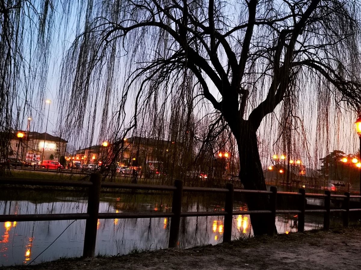 Dal ponte di Fiume Veneto/PN, con luce chiara, un semplice tratto in Parco è stato per me occasione di trèmiti all’imbrunire. La segnaletica indica verso il salice dalla verde chioma, lungo il fiume Fiume e oltre, nel parco del ramo che non scorre, morto appunto. Solo un’ora di tempo in tasca. L’idea di scoprire un’area naturalistica, a piedi, era frenata dal veloce cambio di luce. La parola Mortol, al tramonto, dipingeva di ombre la scena. La voglia di conoscere ha prevalso sui dubbi. Pochi passi e già alle spalle avevo un contesto irreale, veneziano. Il tracciato proseguiva, a dossi e a bassure. Vedevo erbe umide, a terra, in un globale secco come le alte canne palustri. Incontri silenziosi: alberi spogli, qualche merlo, una panchina occupata, spazi con possibili uscite, qualche anima in bici, a piedi. Indifferenti le anatre a riva. Il ramo morto esiste, è un’ansa seminascosta. Lo specchio fluviale scorre veloce, parallelo al viottolo. Chiusa la Chiesa della Beata Vergine Addolorata, XVII sec. La torcia mi ha aiutato a vedere scalini imprevisti, a cogliere la vista di case emergere come in un camèo, un gioiello, inatteso. Un flash di riflessione, citando Ruth Renkel: Non abbiate paura delle ombre, significano che c’è della luce che splende lì vicino. Ripresa la via, il conforto di case vicine. Allo stop potevo tornare nei rumori, invece ho ripreso la via del Parco, tra il buio e le luci dei lampioni, costeggiando in solitaria il fiume che nell’umidità mi nascondeva tanto.  L’atmosfera faceva accelerare. Finite le case, passata la fontana, superate le solitarie panchine, giusto in tempo al ponte e al parcheggio.