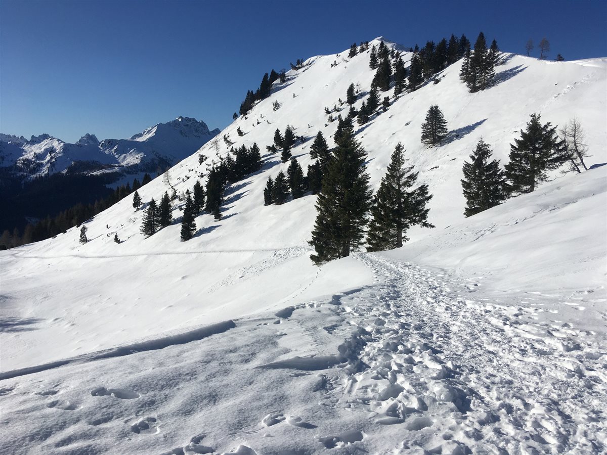 Imboccavo il sentiero Segnavia Cai 204 a valle, dietro l’albergo diffuso ma solamente dopo aver divorato un favoloso panino con il prosciutto locale, in assoluto il più buono che abbia mai mangiato, si sentiva tutto il gusto della montagna. Dopo una prima salita che metteva in difficoltà il respiro e dopo aver attraversato un bosco fatato, si apriva davanti a me un meraviglioso panorama. Soffice distesa bianca, una nuvola di neve e leggerezza, solo lo scricchiolio dei miei passi interrompeva quella quiete. La quota massima raggiunta era 1975 metri, quindi circa 700 m di dislivello dalla partenza. La montagna ha il suo fascino anche d’inverno e non per forza scoprendola sulle piste da sci. Addentrarsi nei boschi innevati è un’esperienza che consiglio vivamente.