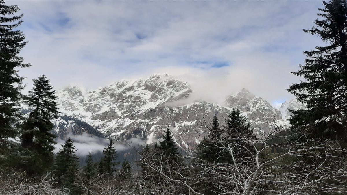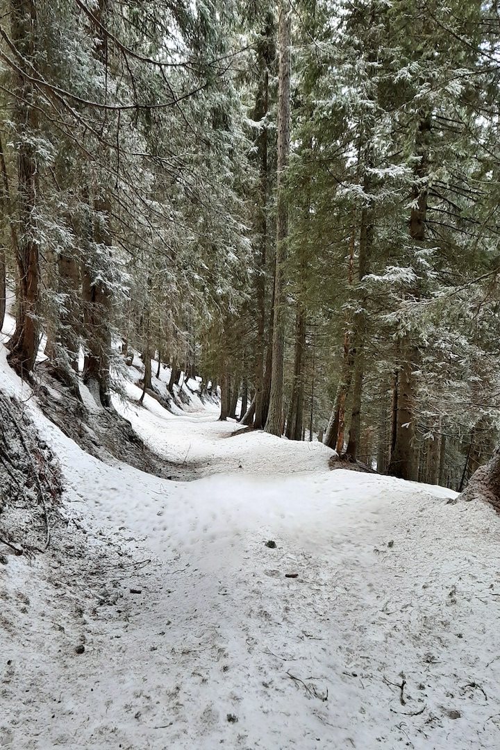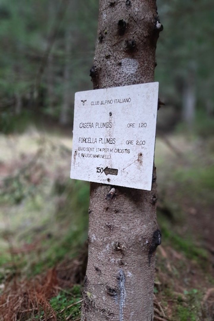 Il cielo coperto porta con sé la promessa della neve e, mentre mi accingo a imboccare il sentiero CAI in direzione della malga Plumbs, i primi fiocchi, lentamente, iniziano a scendere.