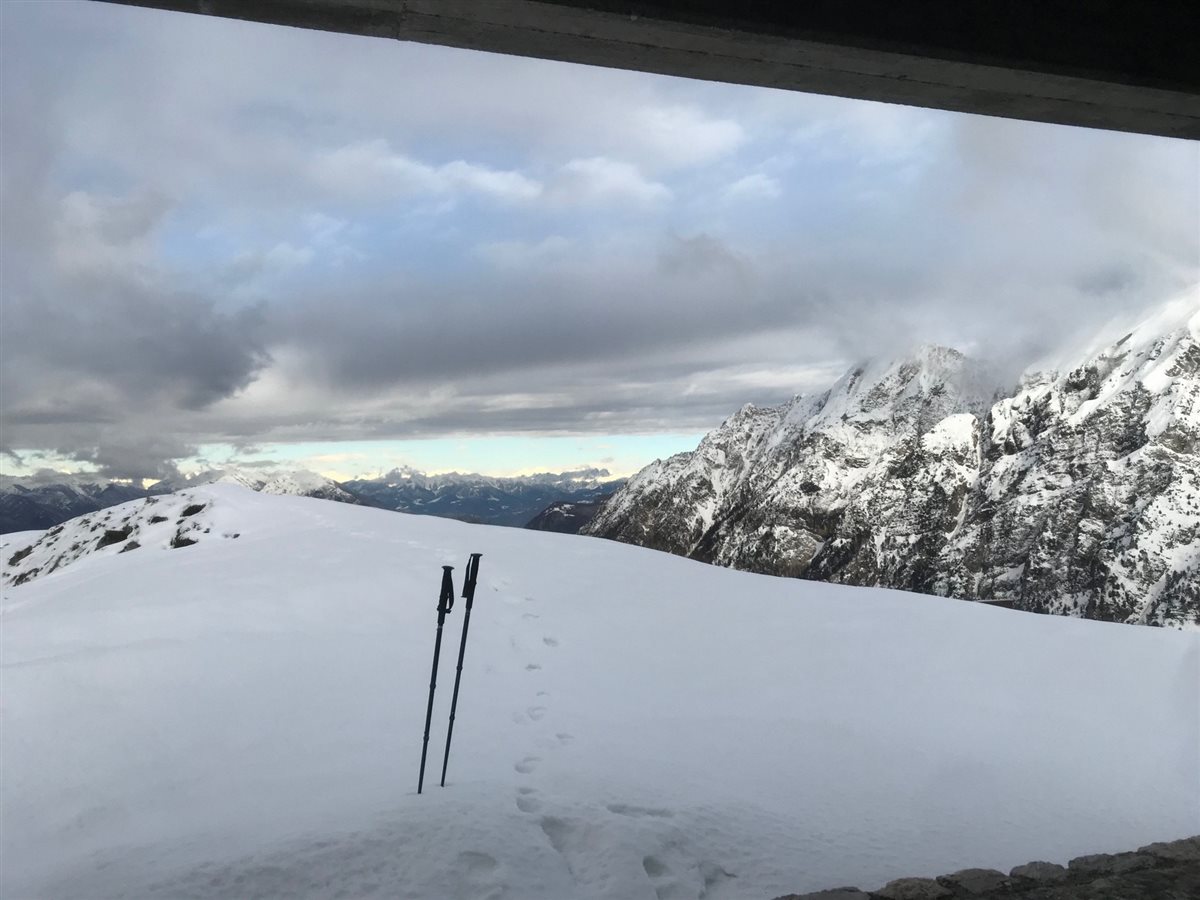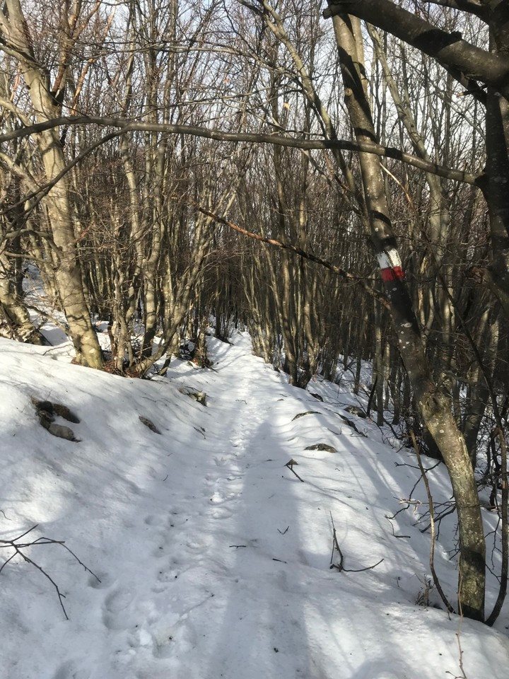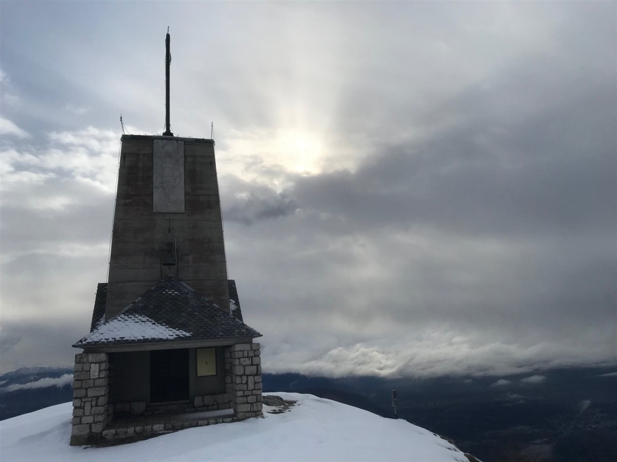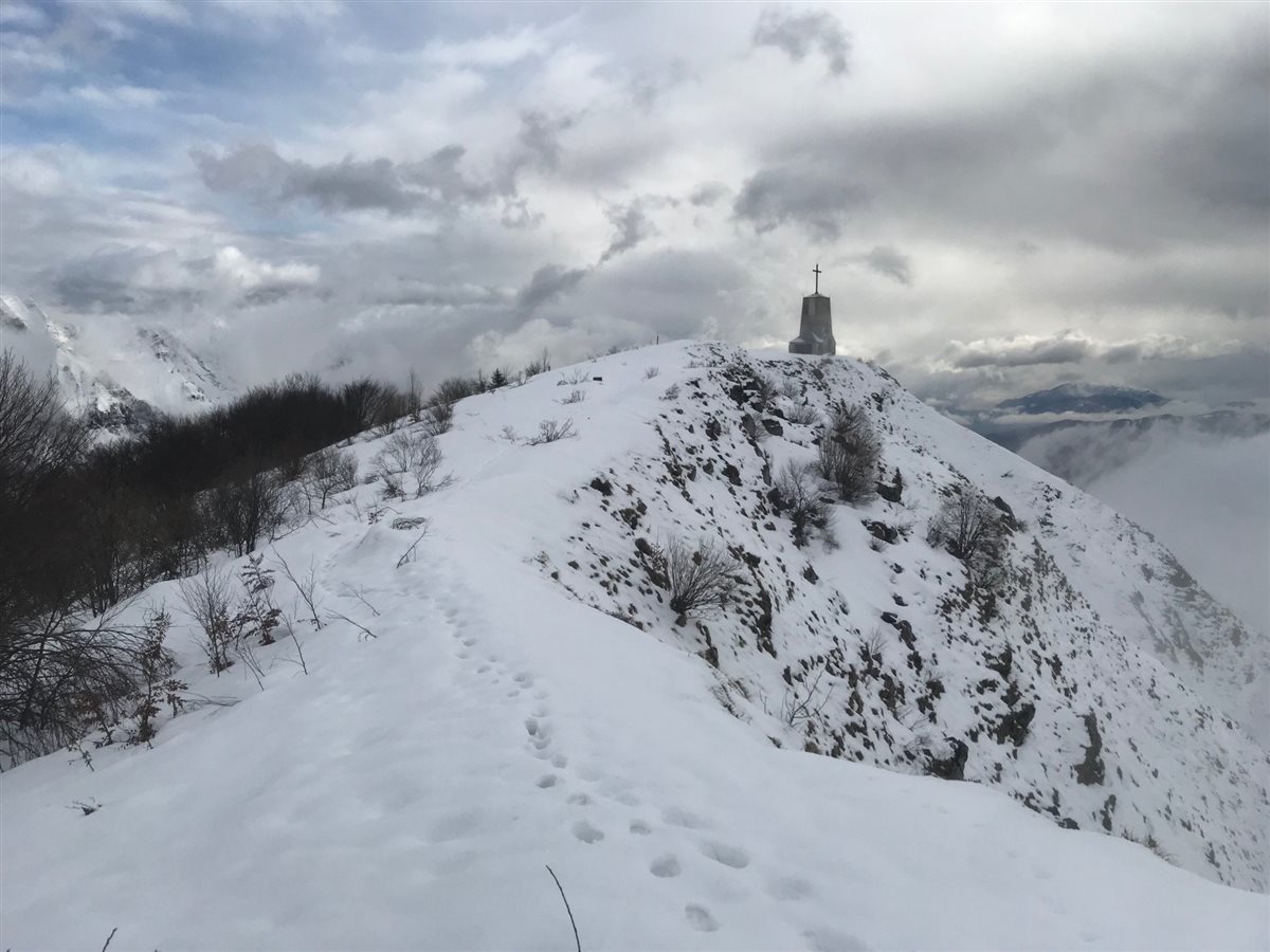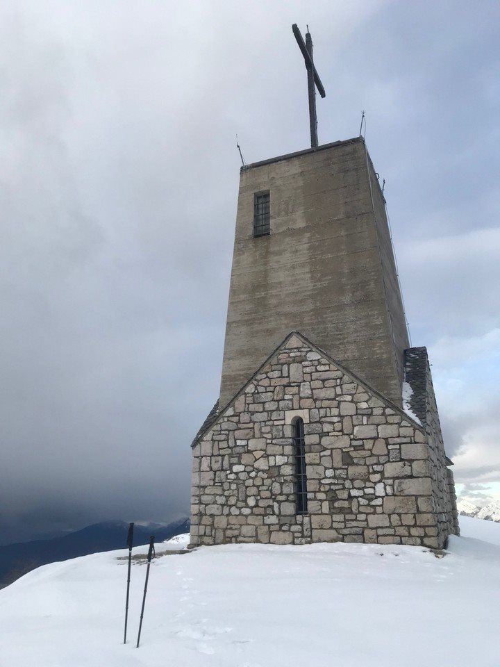 Continuiamo la salita lungo la traccia semi battuta lungo la palizzata attraversando il ricovero Pischiutti, manca poco e siamo in cima dove ci accoglie a 1370 metri la chiesetta con un panorama a 360 gradi a dir poco fantastico, reso ancora più fiabesco grazie alla neve e alle nuvole in rapido movimento. Una camminata di 2 ora abbastanza impegnativa con la presenza di neve alta, che decisamente viene ripagata da un ambiente fantastico. Pranzo al sacco, un po’ di relax, fotografie e poi la discesa, per lo stesso tracciato, fatto in un’oretta.