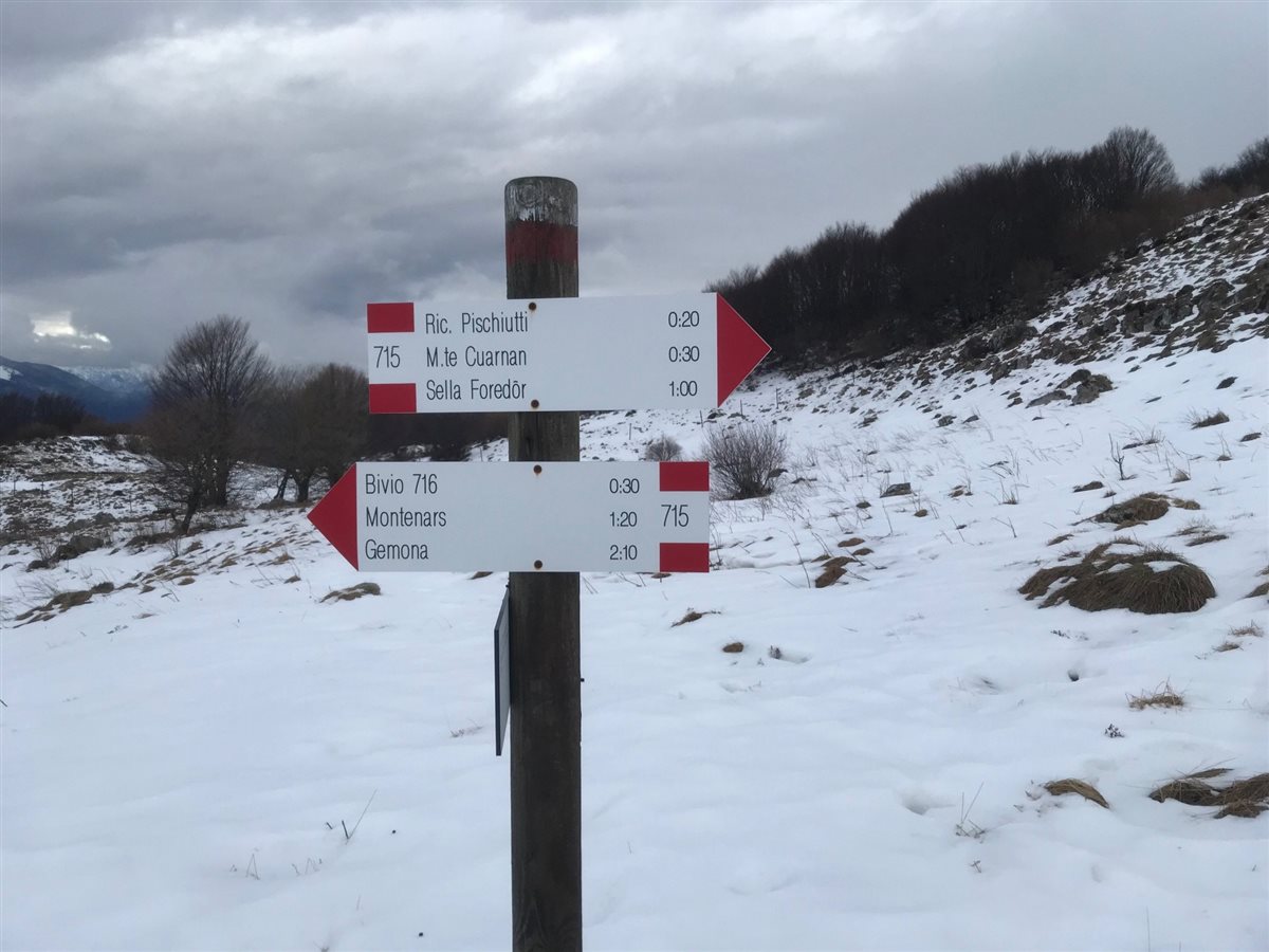 Ci sono tante vie per arrivare alla cima del Cuarnan (dove si trova la chiesetta del Redentore). Noi partiremo da Gemona per la via del Foredor e parcheggiamo l’auto un po’ prima del piccolo gruppo di case dove sulla destra vediamo un crocifisso, nostro punto di partenza (938metri). Giornata uggiosa e la neve la va da padrona, partiamo subito in salita, incrociando per due volte la strada asfaltata che va alla malga Cuarnan, attraversiamo il fitto bosco ed in mezz’ora arriviamo al primo altopiano dove ci sono due mulattiere ed un piccolo laghetto, 2 minuti ancora e arriviamo allo spiazzo per il lancio con il parapendio. Già si usufruisce di una bella vista, nonostante le nuvole.