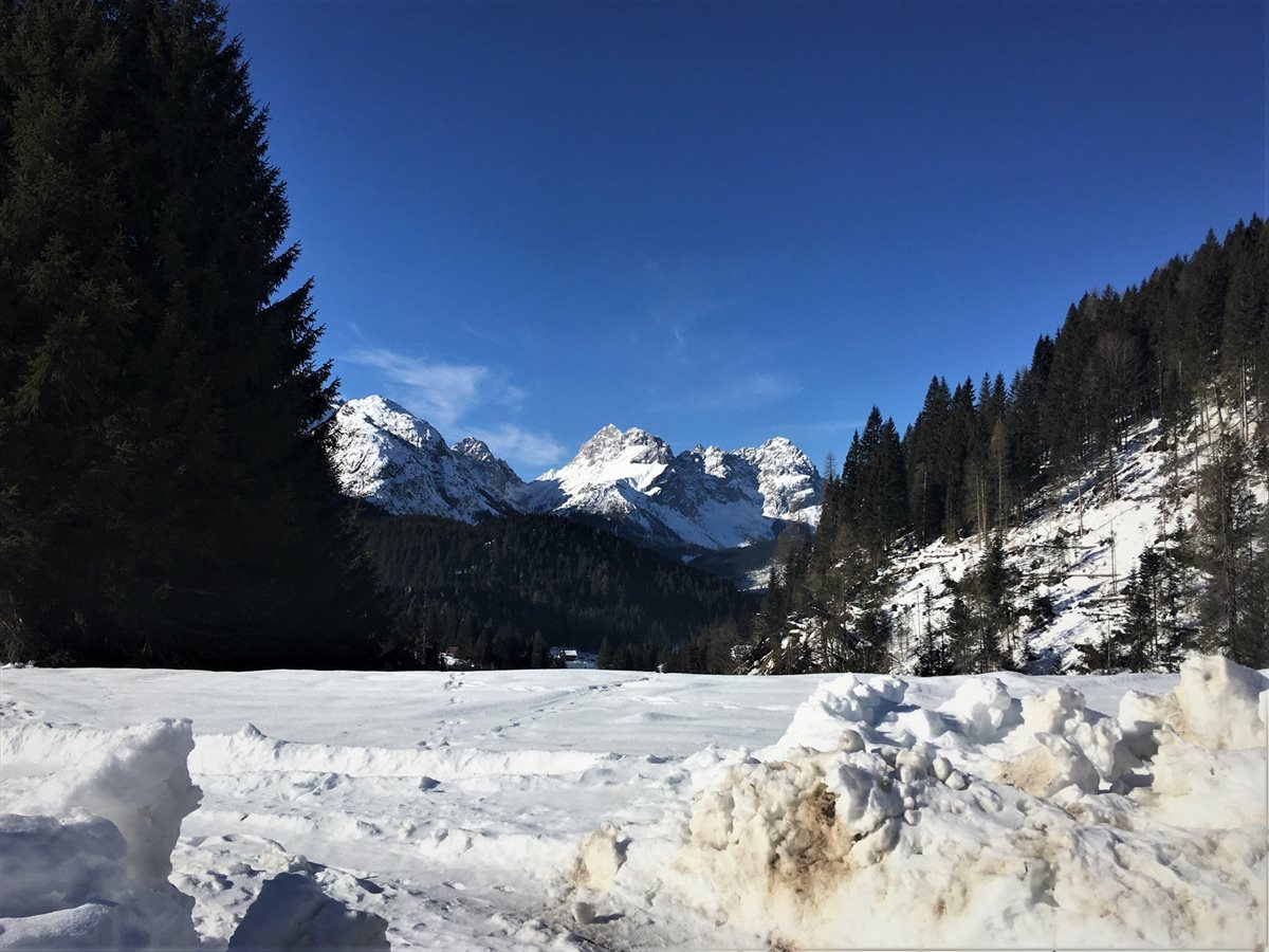 Il risveglio è bianco, è magico. Siamo a Cima Sappada, la famiglia è pronta per l’escursione verso le Sorgenti del Piave, situate alla base del Monte Peralba. Pizzica il naso, l’aria è fredda, il cielo terso. Dopo esserci vestiti adeguatamente, prendiamo il sentiero proprio dietro casa. D’estate consiglierei di arrivare con la macchina fino al rifugio Piani del Cristo, dal momento che vi è una strada asfaltata, per poi proseguire a piedi. Durante il periodo invernale invece, merita addentrarsi nel bosco e partire proprio dal centro di Cima Sappada. Lungo la strada troverete diversi cartelli che indicano la Baita Rododendro (tappa intermedia della nostra gita). Si tratta di un’escursione agevole che sale gradualmente per raggiungere un’altitudine massima di 2037m, se vi fermate alle sorgenti ovviamente. Ci sono lunghi tornati, la neve sovrasta i rami degli alberi, sembrano affaticati dal sorreggere il peso di questo manto così spesso. Dopo circa 40 minuti di cammino, dopo la baita Rododendro, giungiamo ad un bivio: a destra potete intraprendere il sentiero per il Percorso della Grande guerra, o Forcella delle Genziane e passo Cacciatori. Da questo punto alle sorgenti mancano circa altri 40 minuti, ad un passo regolare. Arriviamo in cima, sono circa 9 km dalla partenza, per un totale di 18 km. Vette imponenti si presentano come delle regine orgogliose. Il panorama è favoloso. Siamo ai piedi del Monte Peralba (2690m). Da questo punto in poi si potrebbero intraprendere altre escursioni, noi, per questa volta, ci fermiamo qui e ammiriamo quello che la natura ci ha regalato: un momento di pace in famiglia, per un attimo, lontano da tutti i pensieri che ci possono affliggere.