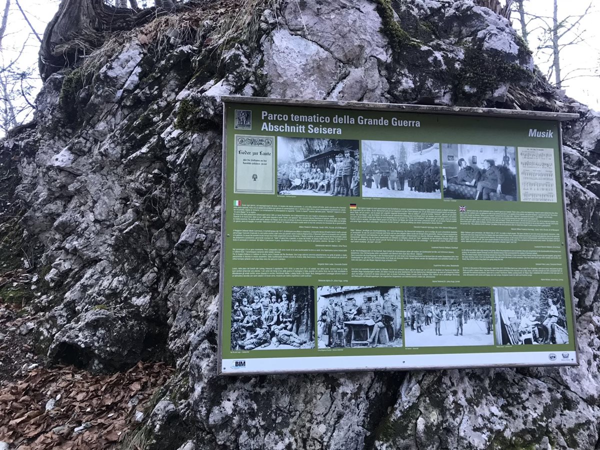 Questo è un percorso con tante anime e offre numerosi spunti naturalistici, artistici, storici e di riflessione. Io sto ancora ripensando alla storia di Heinrich e Beppo, quasi “amici” in quel lontano 1915, quando era proibito anche solo pensare di essere qualcosa più che nemici… li trovate là, secondo abete a destra, qualche passo dopo la pietra a forma di cuore, proprio di fronte alla chitarra sulla roccia…