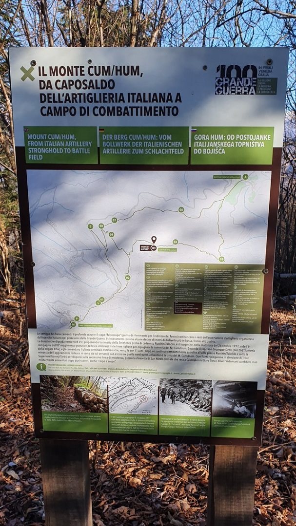 Spinto dalla mia passione per le camminate e la curiosità di visitare i luoghi dove è stata combattuta la Grande Guerra, decido di raggiungere la cima del Monte Cum ( Hum in dialetto sloveno, ) partendo da Tribil Superiore, un bel paesino nel comune di Stregna (UD).