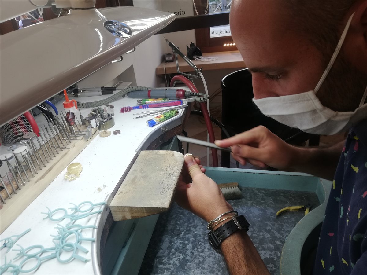Seconda tappa del nostro tour il laboratorio orafo Oricalco, una piccola bottega dove Francesco porta avanti l’arte della lavorazione dell’oro tramandata dai genitori e appresa fin da bambino, quando si dilettava nei primi esperimenti utilizzando le pietre di scarto. Partendo da un calco di cera Francesco modella gioielli personalizzati su richiesta dei suoi clienti oppure dona nuova vita a gioielli preesistenti plasmandoli in nuove forme.