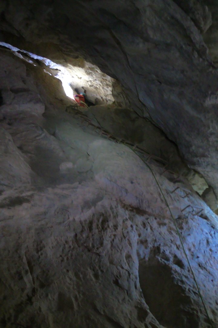La visita alle gallerie superiori richiede la salita (in sicurezza!) di una ripida parete, aiutati da scalini infissi nella roccia. Raggiuntone il culmine ci troviamo davanti a un vero e proprio labirinto di gallerie che talvolta si intersecano su piani diversi facendo vedere dall'alto il percorso fatto in precedenza! Ma la sorpresa è l'ampio finestrone naturale con splendida veduta verso Timau. Una bellissima avventura unica nel suo genere!
