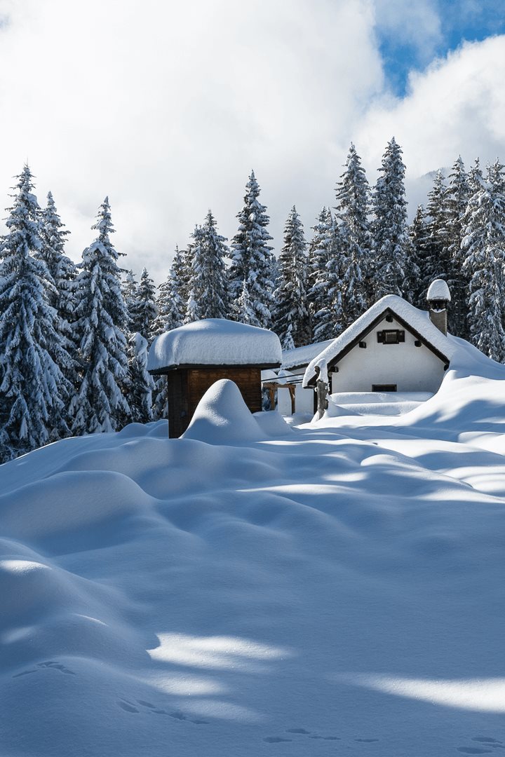Dopo 4 km di camminata, oltrepassiamo l’agriturismo La Baita di Beatrice. Da qui, la Val Bartolo svela la sua delicata bellezza con i graziosi chalet che costellano come diamanti i campi candidi. Ciaspoliamo estasiati fino all’Austria e da lì torniamo sui nostri passi.