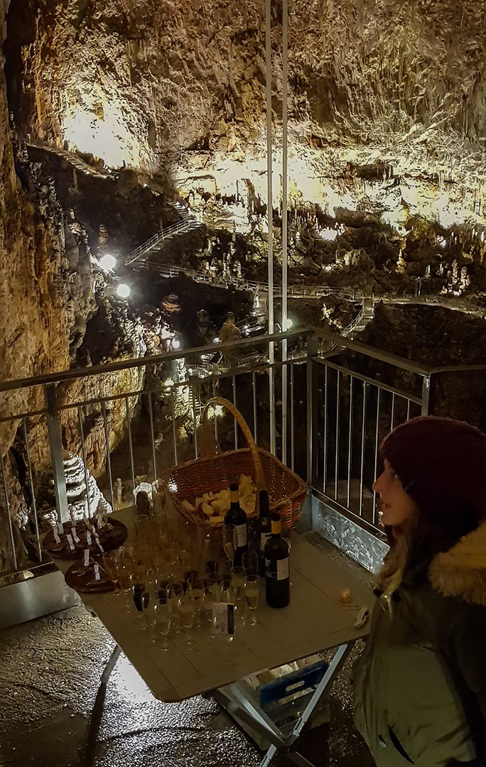 Aperitivo con prodotti tipici del Carso, salumi, formaggi e pane, accompagnati da ottimo vino. Il tutto in un contesto a dir poco inusuale e spettacolare.