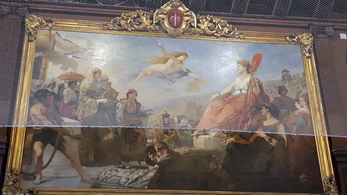 Il dipinto, di ordine politico, esalta la città nelle vesti di matrona romana a sottolineare come la storia della città inizi con l'antichità. Nella realizzazione, in una composizione a puzzle tipica della pittura di Dell'Acqua, troviamo anche la rappresentazione della Telegrafia, la personificazione dei popoli importanti con cui Trieste aveva relazioni commerciali e dei luoghi salienti per la vita cittadina. Divisi in gruppi siamo poi passati nel famoso Salotto Azzurro, sede degli appuntamenti istituzionali del Sindaco, dove è presente il dipinto L'allegoria della navigazione realizzato da Hans Makart nel 1878 in occasione dei festeggiamenti per le nozze d'argento dell'Imperatore Francesco Giuseppe e della consorte Elisabetta.