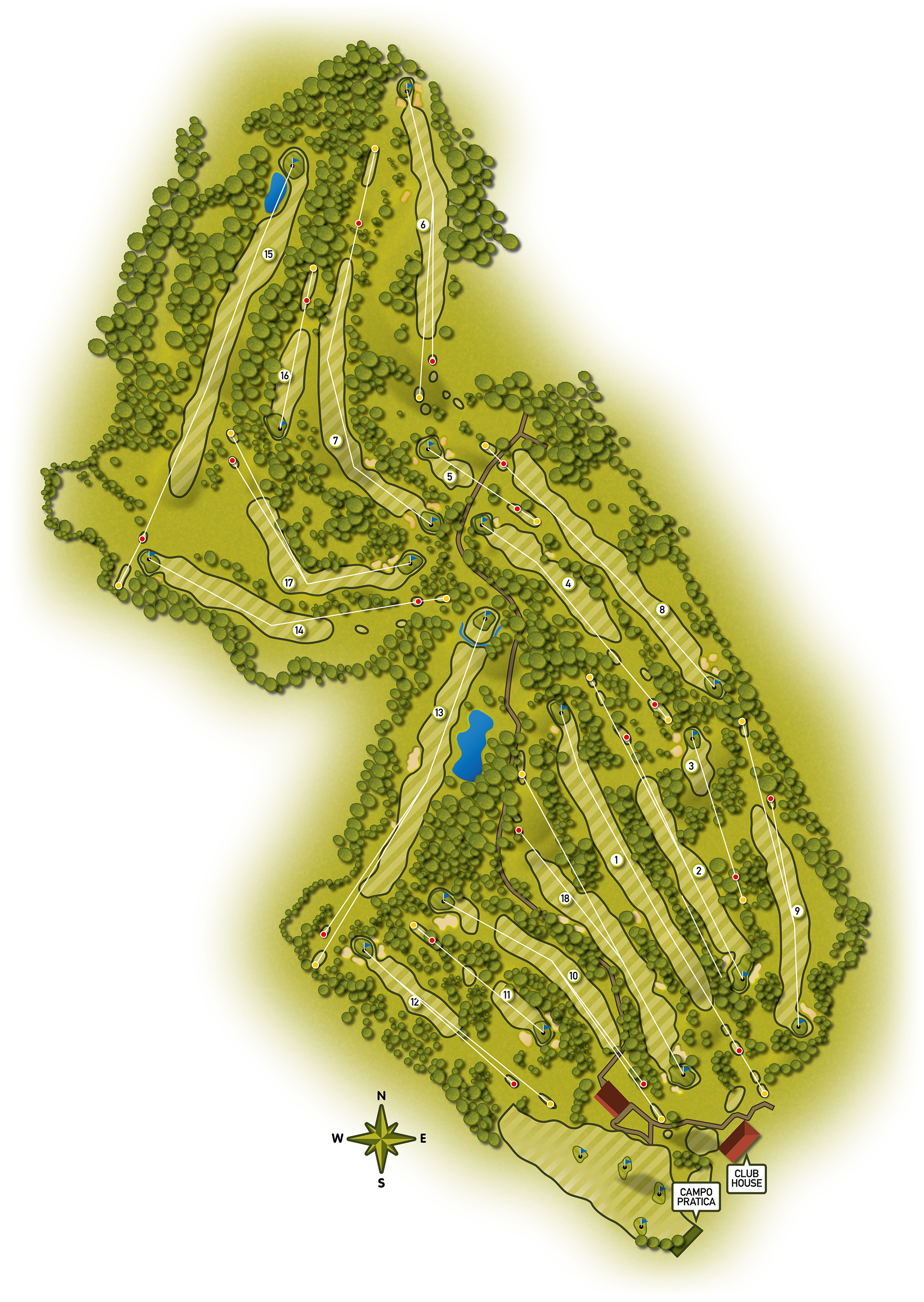 Nel corso degli anni il tracciato di 9 buche, già disegnato dagli architetti John Harris e Marco Croze, è stato completato da quest'ultimo portandolo alle attuali 18 buche integrate con armonia in 60 ettari. Il tracciato di gara è un Par 72 senz'altro impegnativo, soprattutto a causa dei numerosi ostacoli naturali posti lungo gli oltre 6.000 metri del campo. Nuovo campo pratica adatto per Golf Clinic.