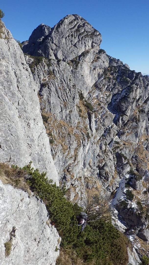 Sotto le pareti una rampa con andamento in salita obliqua da destra a sinistra passa sotto il monolite del becco e permette di superare la parete dell’ala sinistra fino al suo limite estremo dove larghi pendii di pini mughi portano in cima.