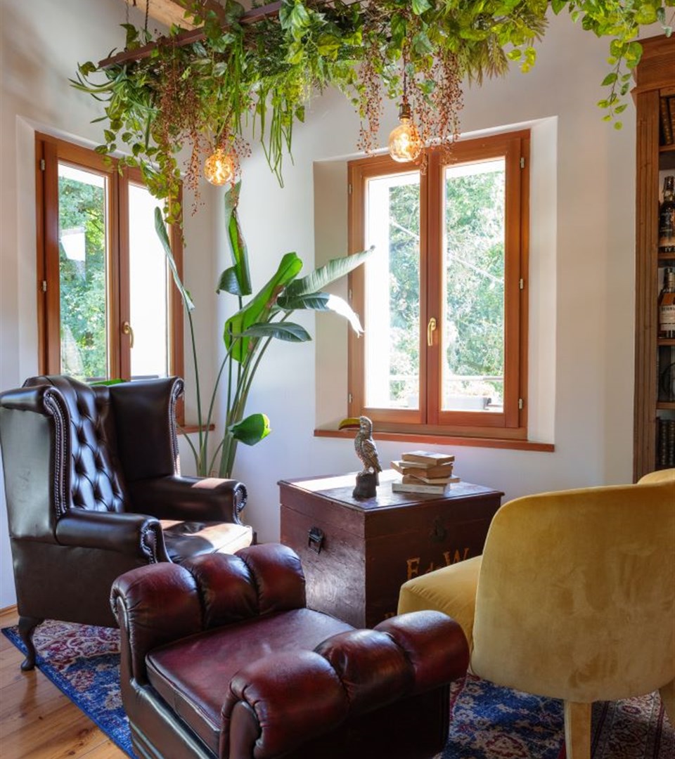 Il locale dispone di diversi spazi per soddisfare le esigenze dei nostri clienti. Al piano superiore, c'è un salottino intimo e accogliente con poltrone confortevoli, ideale per l'aperitivo o per una cena romantica. La sala principale è più grande e adatta per il ristorante, mentre all'esterno vi sono due plateati, uno nella corte interna e l'altro con vista sul parco e sulla villa storica.