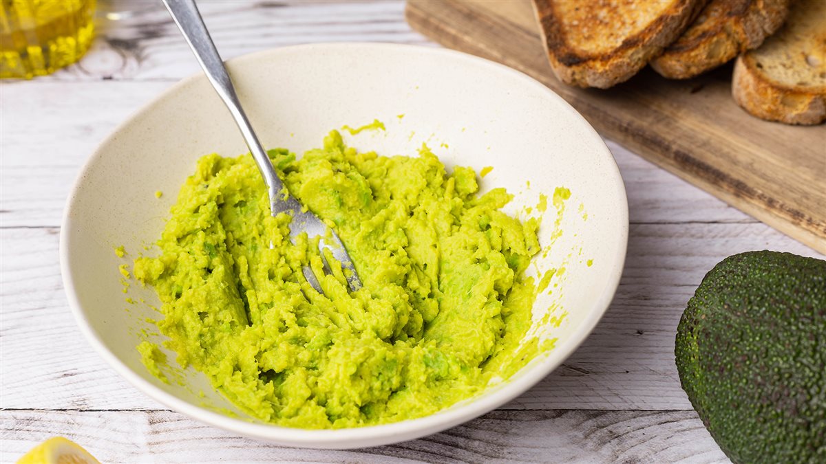 - Preparare una crema di avocado schiacciando la polpa con una forchetta, aggiungendo limone, sale e pepe.