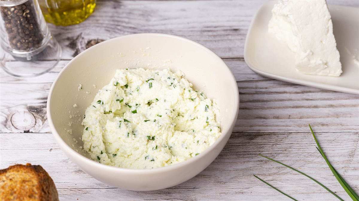 - In un’altra ciotola, lavorare la ricotta con l’erba cipollina tritata, un filo d’olio, sale e pepe.