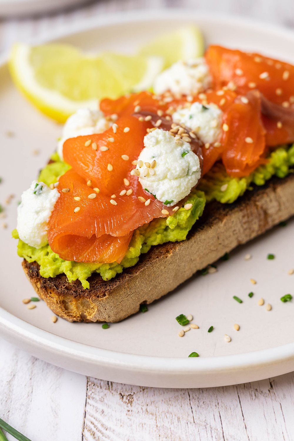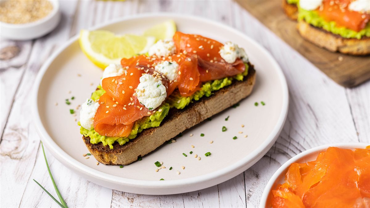 - Comporre il toast: spalmare la crema di avocado sul pane, aggiungere i filetti di trota affumicata, ciuffetti di ricotta e completare con i semi di sesamo.