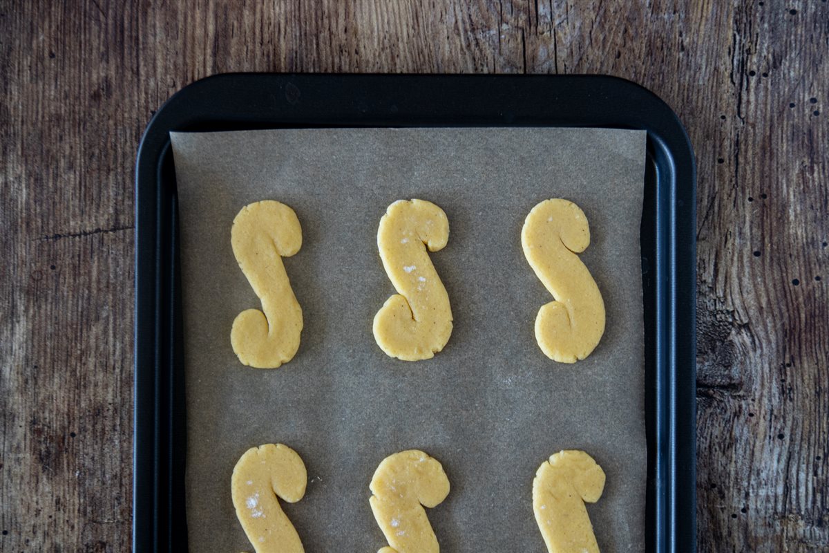 Una volta raffreddato, prelevate porzioni di impasto da circa 20 g l’una e, su una spianatoia infarinata, formate dei filoncini lunghi 13 cm. Modellateli a forma di "S", poi schiacciateli leggermente con un tagliere.