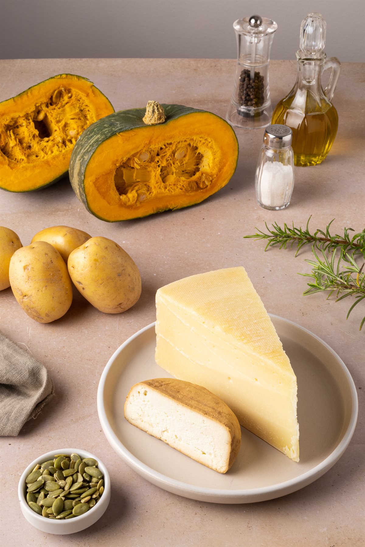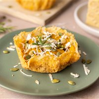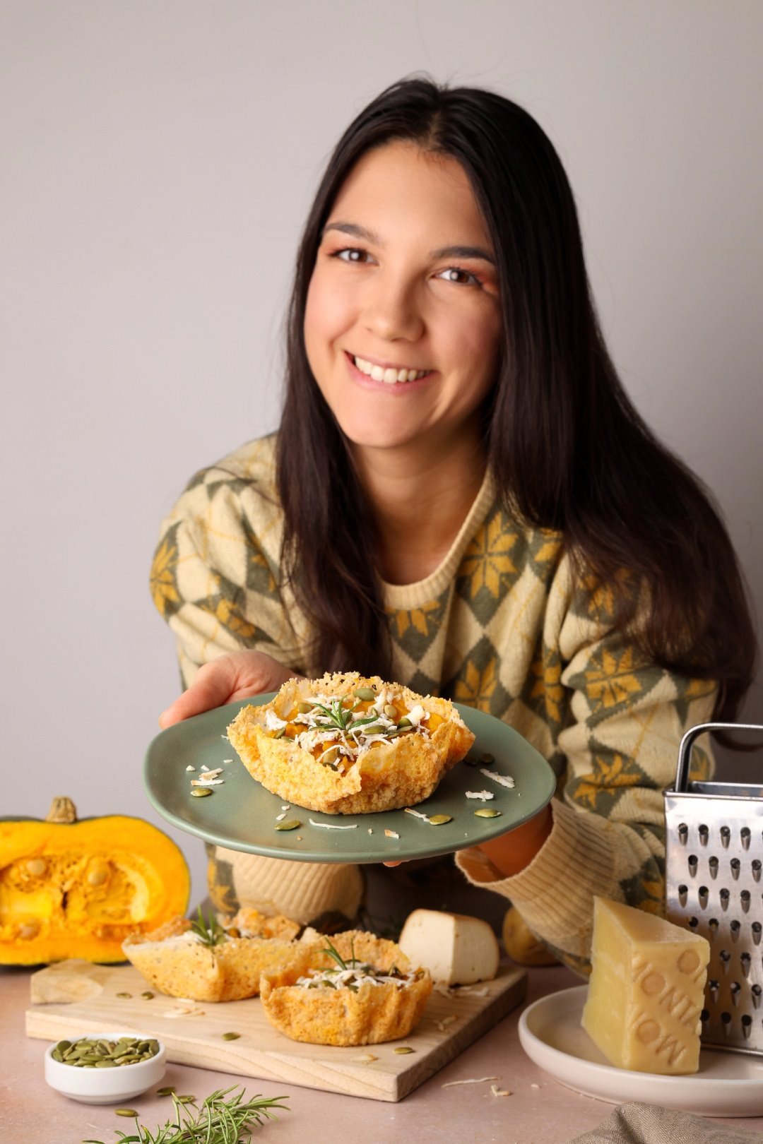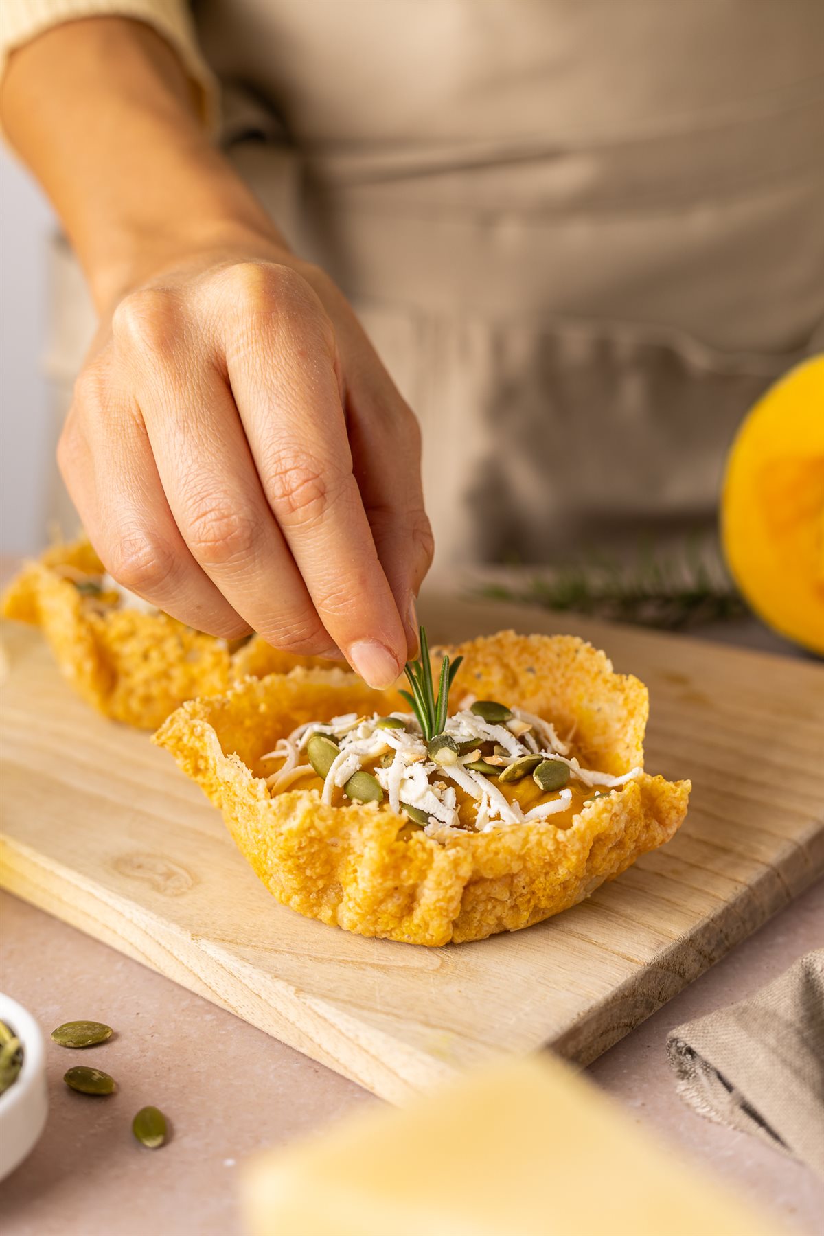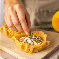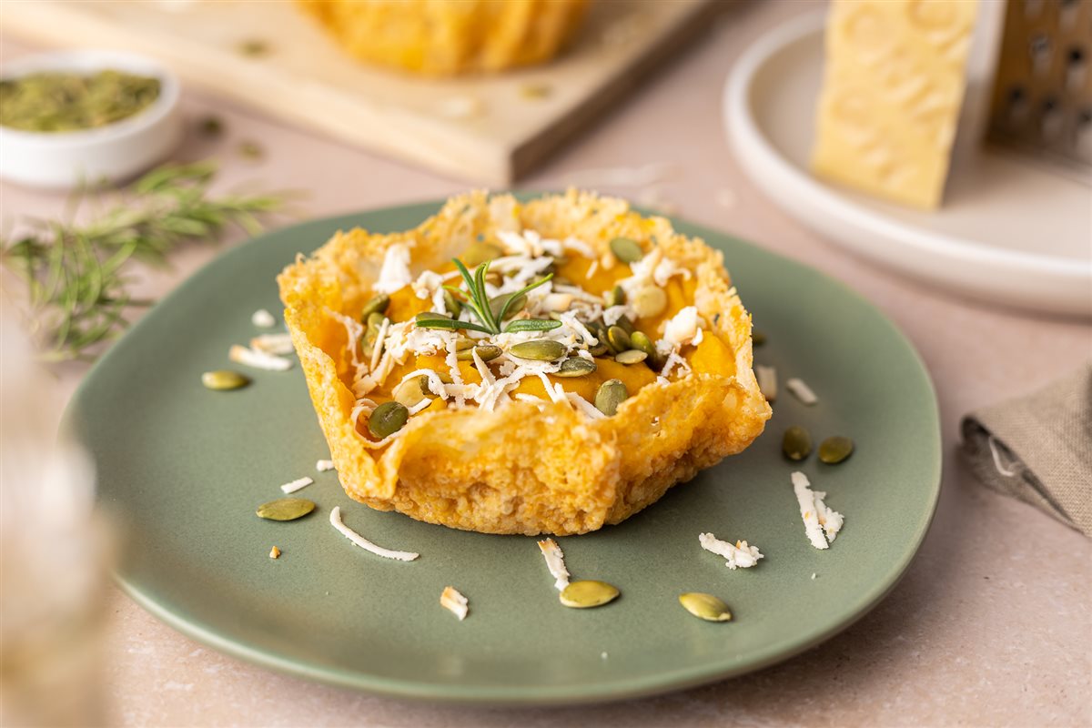 La croccantezza dei cestini di formaggio Montasio si fonde con la morbidezza della crema di zucca e patate, profumata da qualche ago di rosmarino.