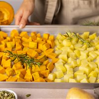 Sbucciate zucca e patate, riduceteli a cubetti e disponeteli su una teglia con carta forno. Aggiungete rosmarino, sale, pepe e un filo d’olio evo.