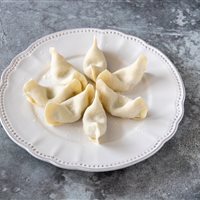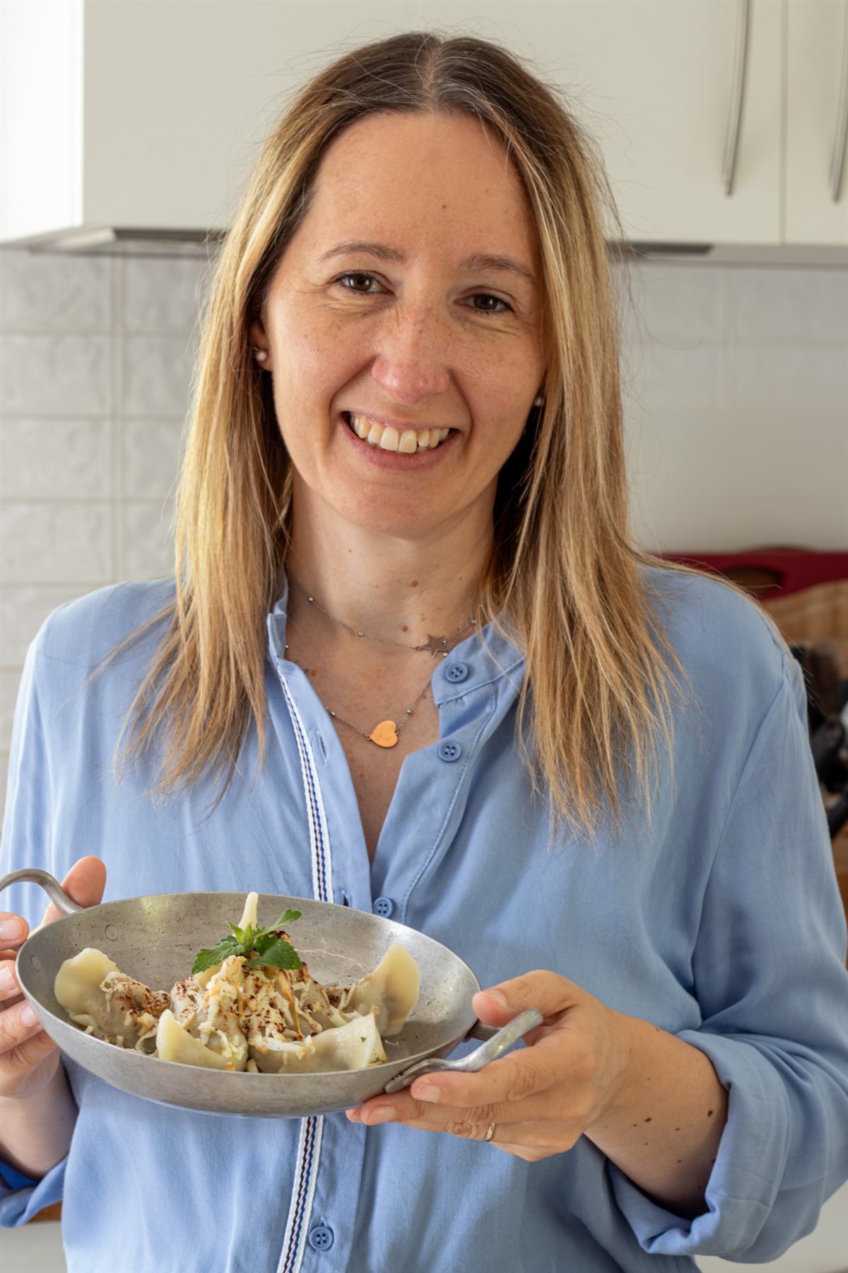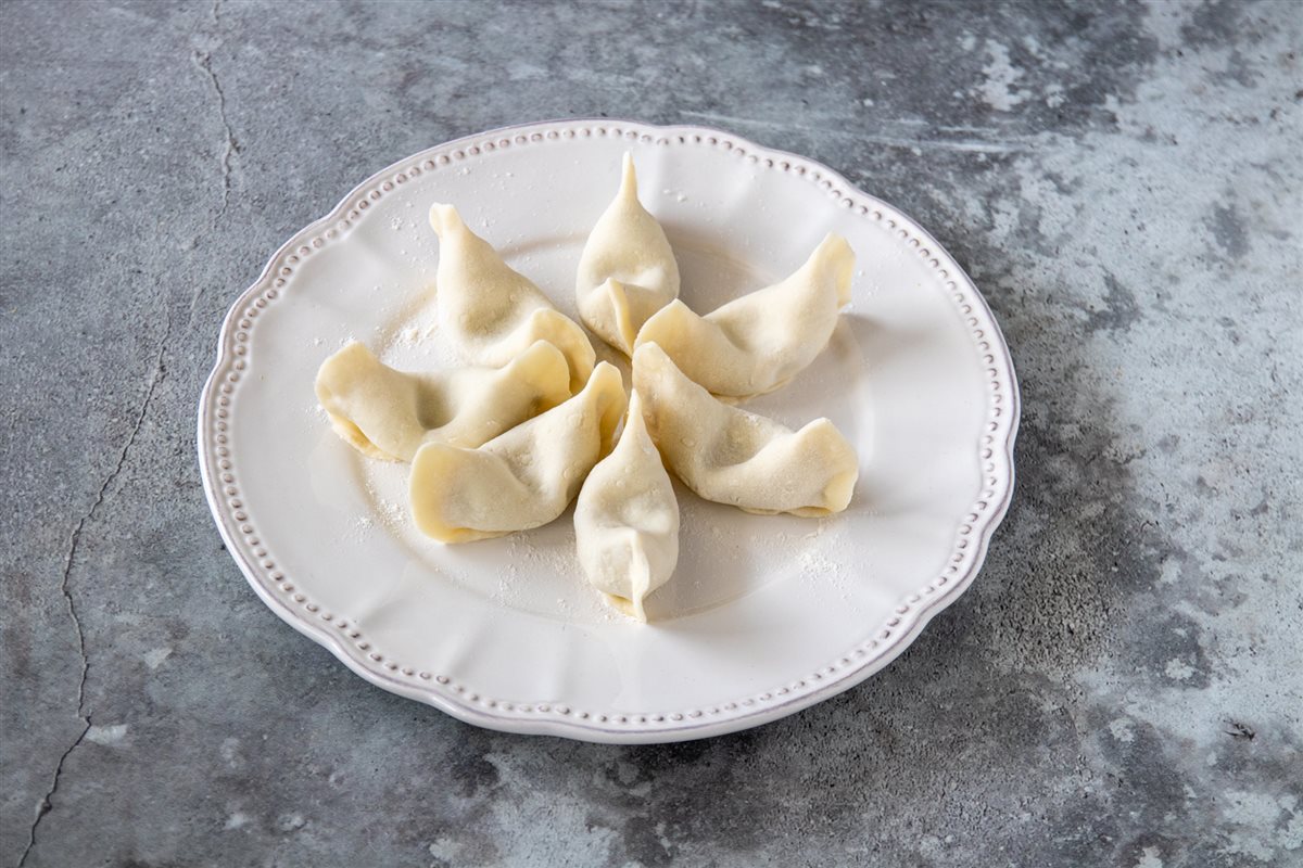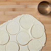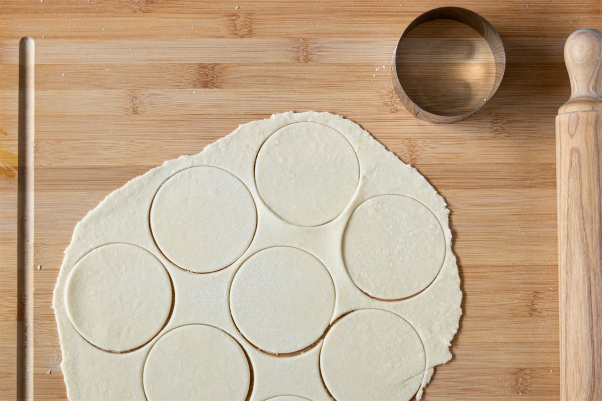 Portate a bollore l’acqua e versatela poco per volta sulla farina, impastando fino a ottenere una consistenza liscia e compatta. Stendete la pasta con il mattarello in una sfoglia sottile e ricavate dei dischi di circa 8 cm di diametro.
