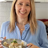 Pelate e schiacciate le patate con una forchetta, poi tritate finemente le erbe aromatiche. Unite tutti gli ingredienti in una ciotola e amalgamate bene fino ad ottenere un composto omogeneo. Lasciate riposare in frigorifero per una notte: il riposo è fondamentale per armonizzare i sapori.