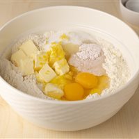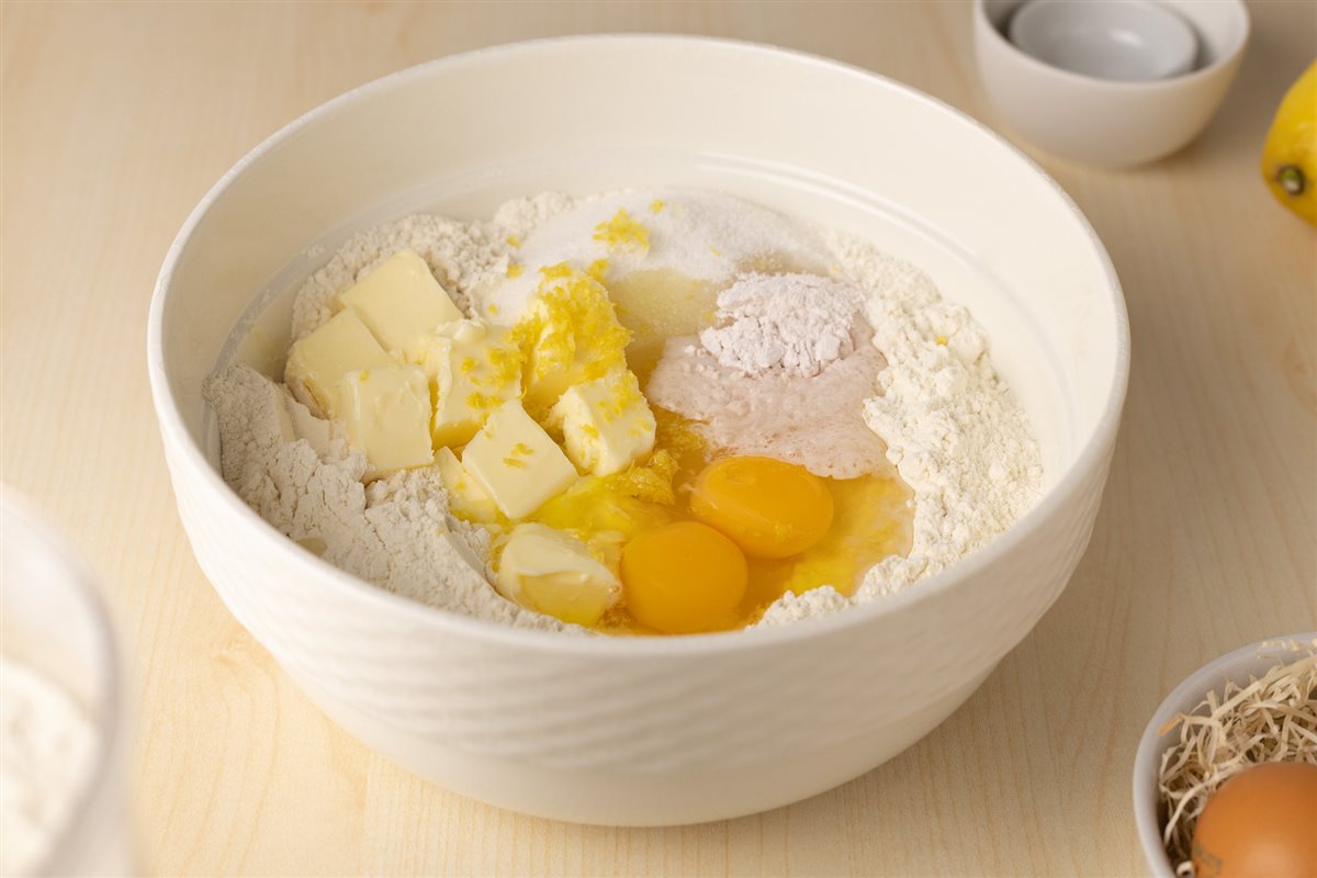 In una ciotola capiente versate la farina e aggiungete tutti gli altri ingredienti: uova, burro ammorbidito, zucchero, scorza di limone, lievito e 2 cucchiai di grappa (o acqua).