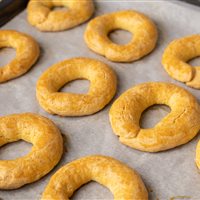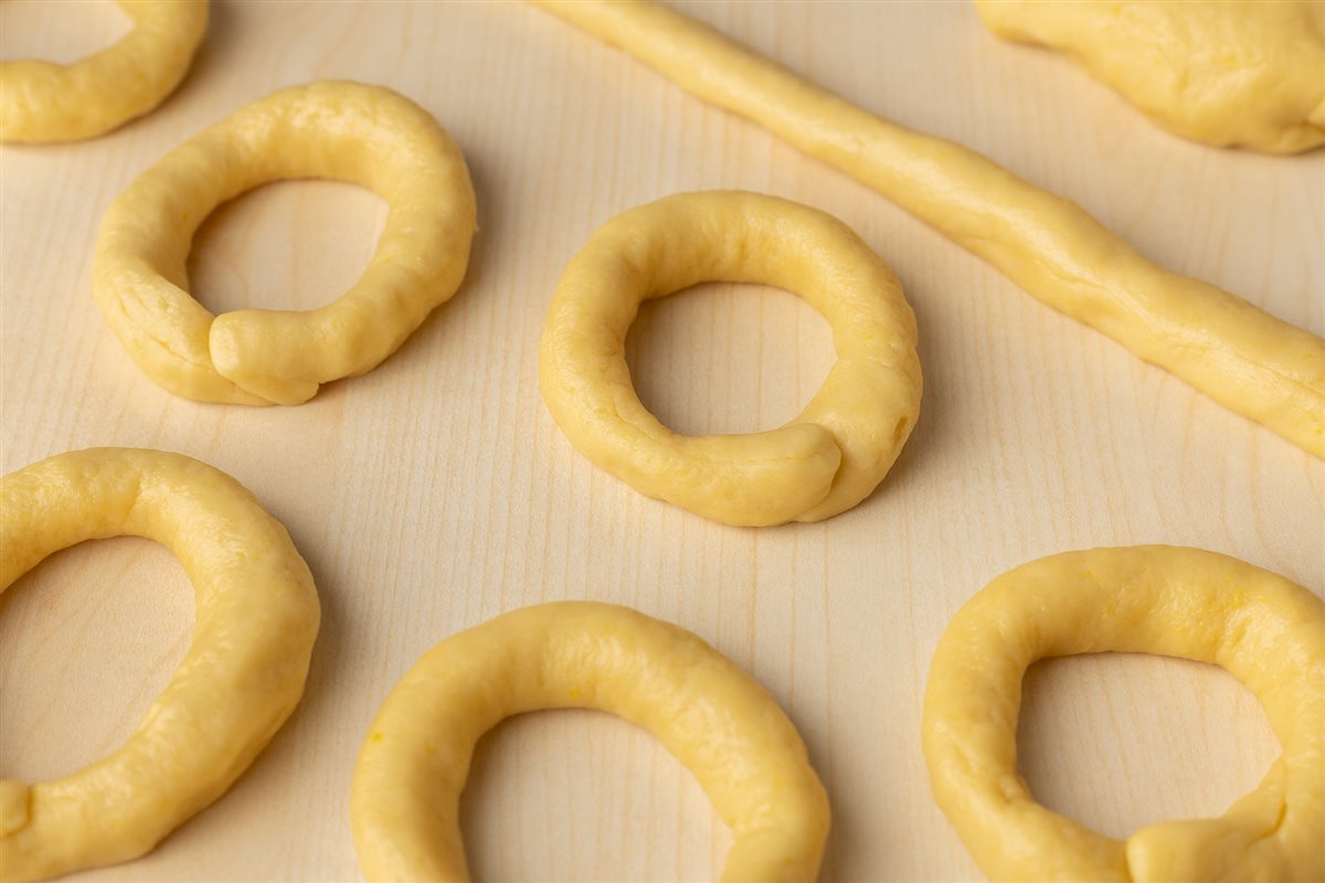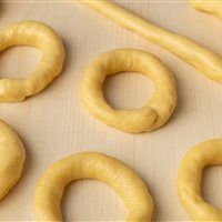 Formate dei “serpentelli” di circa 2 cm di diametro e chiudeteli a formare delle ciambelline di circa 5 cm.