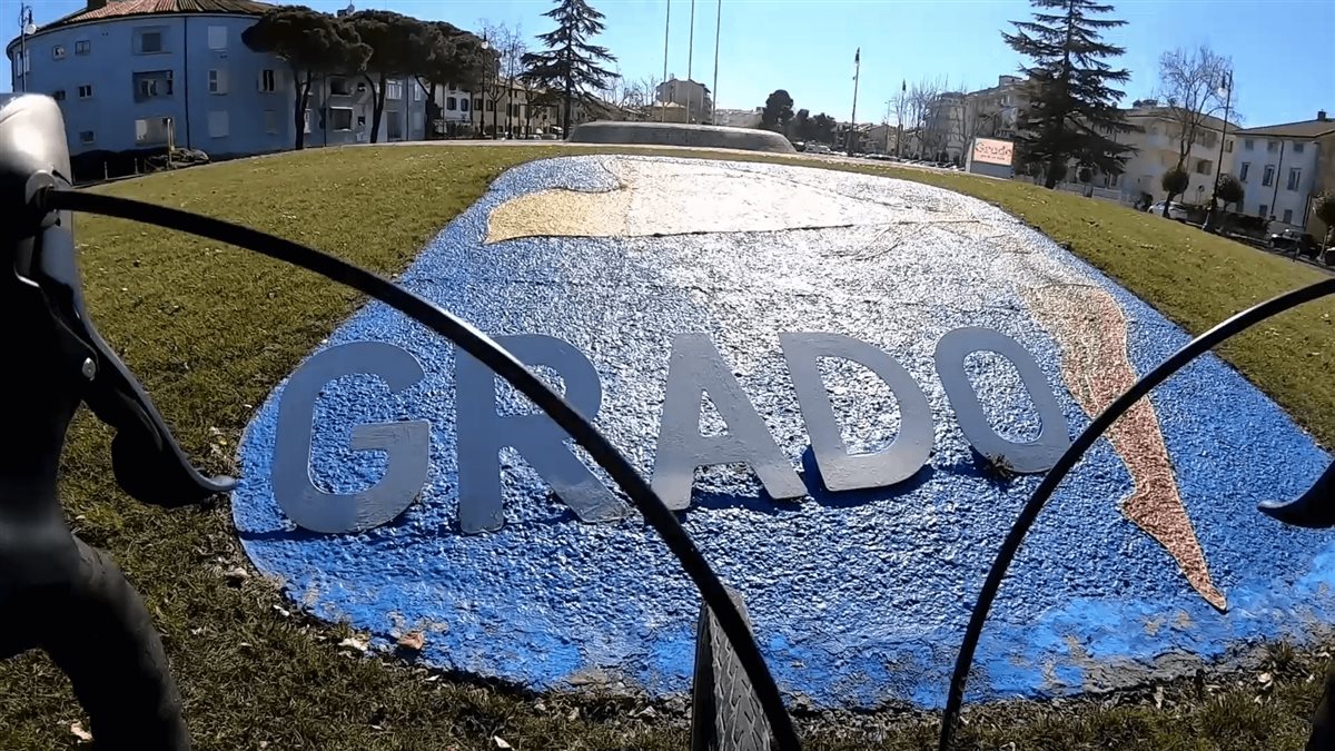 L’aiuola addobbata con il nome di Grado sulla rotonda d’ingresso indica chiaramente che si è giunti a destinazione e ci si può rifocillare in qualche ristorantino o rilassarsi sotto il sole in spiaggia.