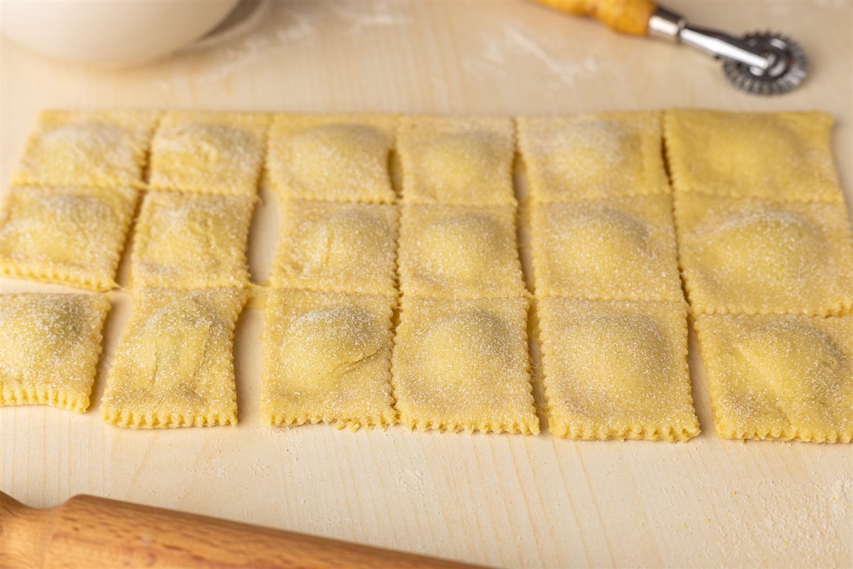 Su metà sfoglia disporre distanziate delle piccole dosi di ripieno ai semi di papavero e coprire con il resto della sfoglia sigillando bene i bordi.