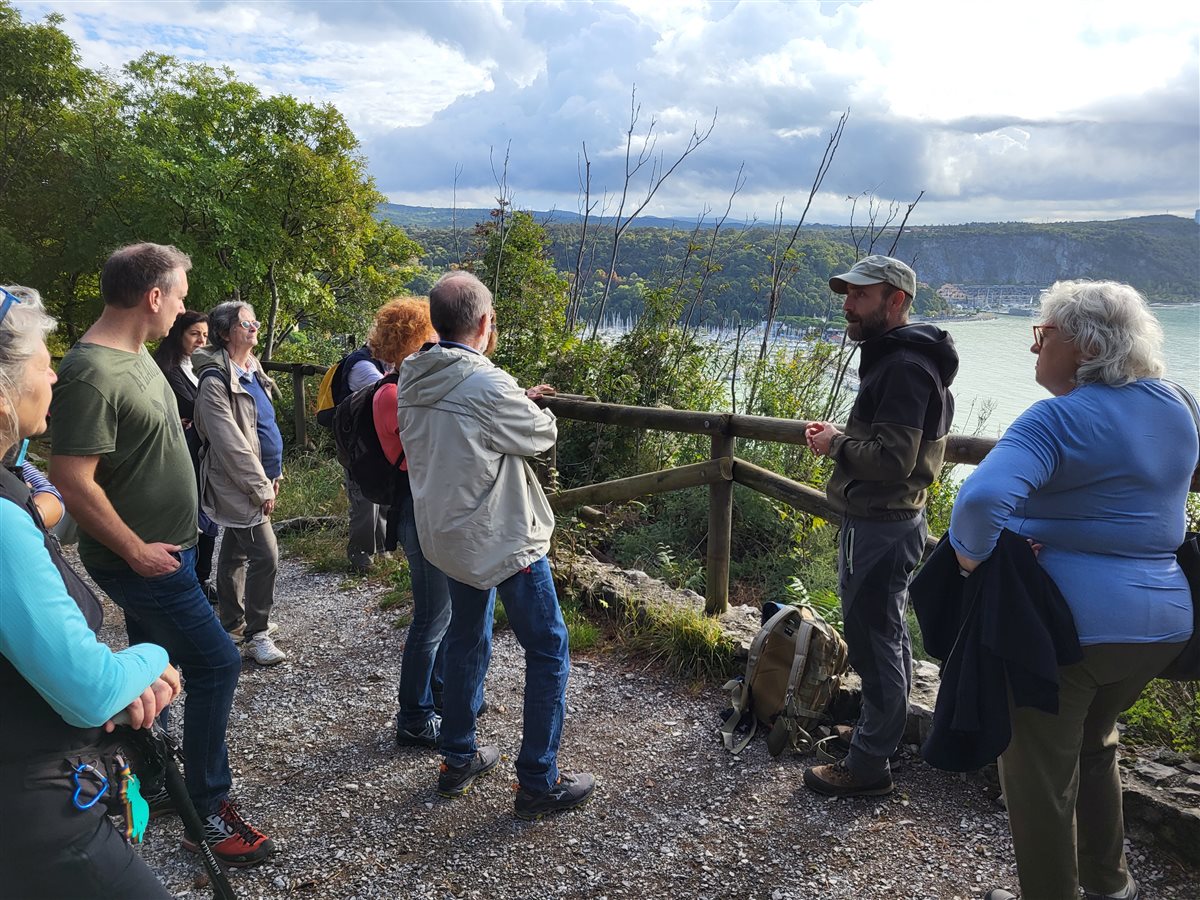 La nostra esplorazione è iniziata all’Infopoint di Sistiana. Il percorso si snoda lungo la scogliera in direzione di Duino, offrendoci scorci mozzafiato di un paesaggio carsico in continua evoluzione grazie alla potenza dell'azione combinata del tempo, dell'acqua e del vento nel particolare microclima del Carso Triestino. Con Umberto Fagotto, la nostra guida, abbiamo approfondito la conoscenza di piante, animali e geologia locale, rendendo la passeggiata educativa e coinvolgente per tutto il gruppo che nell’interagire e stupirsi insieme ci ha fatti sentire tutti amici.
