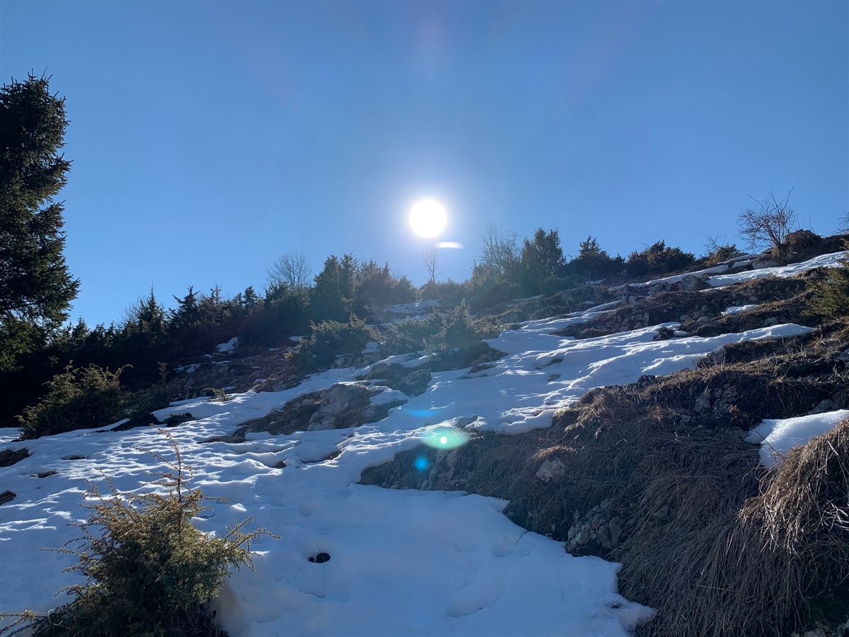 Il desiderio di evasione deve conciliare con le potenzialità, perciò non è ancora tempo per uscite solitarie: meglio affidarsi ad una guida esperta. Fabrizio ha messo su un variegato gruppo a cui mi aggrego entusiasta: persone di ogni età vociano allegre mentre indossiamo gli scarponcini da trekking. Qualche battuta partendo dal piccolo borgo di Mezzomonte, sopra Polcenigo, poi, a parlare, sarà lo scalpiccio dei passi sulle foglie secche. Potrebbe sembrare una soleggiata uscita autunnale: sul terreno numerose castagne, ma già ci salutano i guizzi gialli delle primule.
