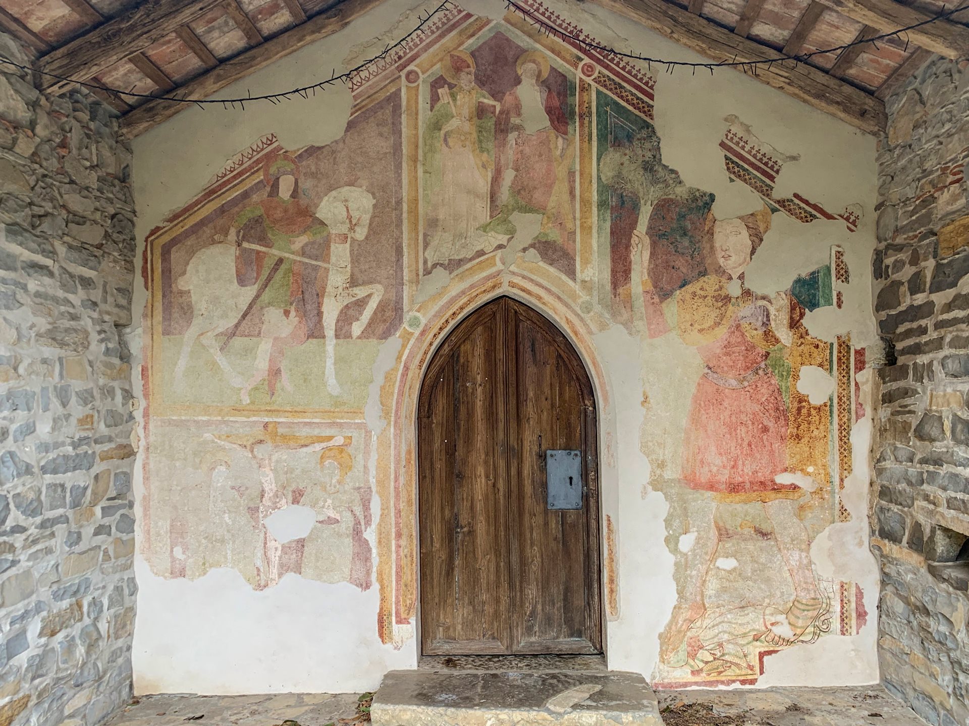 Un piccolo sagrato recintato conduce all’atrio aperto su tre lati. La facciata presenta al colmo del tetto una bifora campanaria; la muratura è in pietra rozzamente squadrata con angolari a vista; la copertura è in coppi, su struttura lignea.