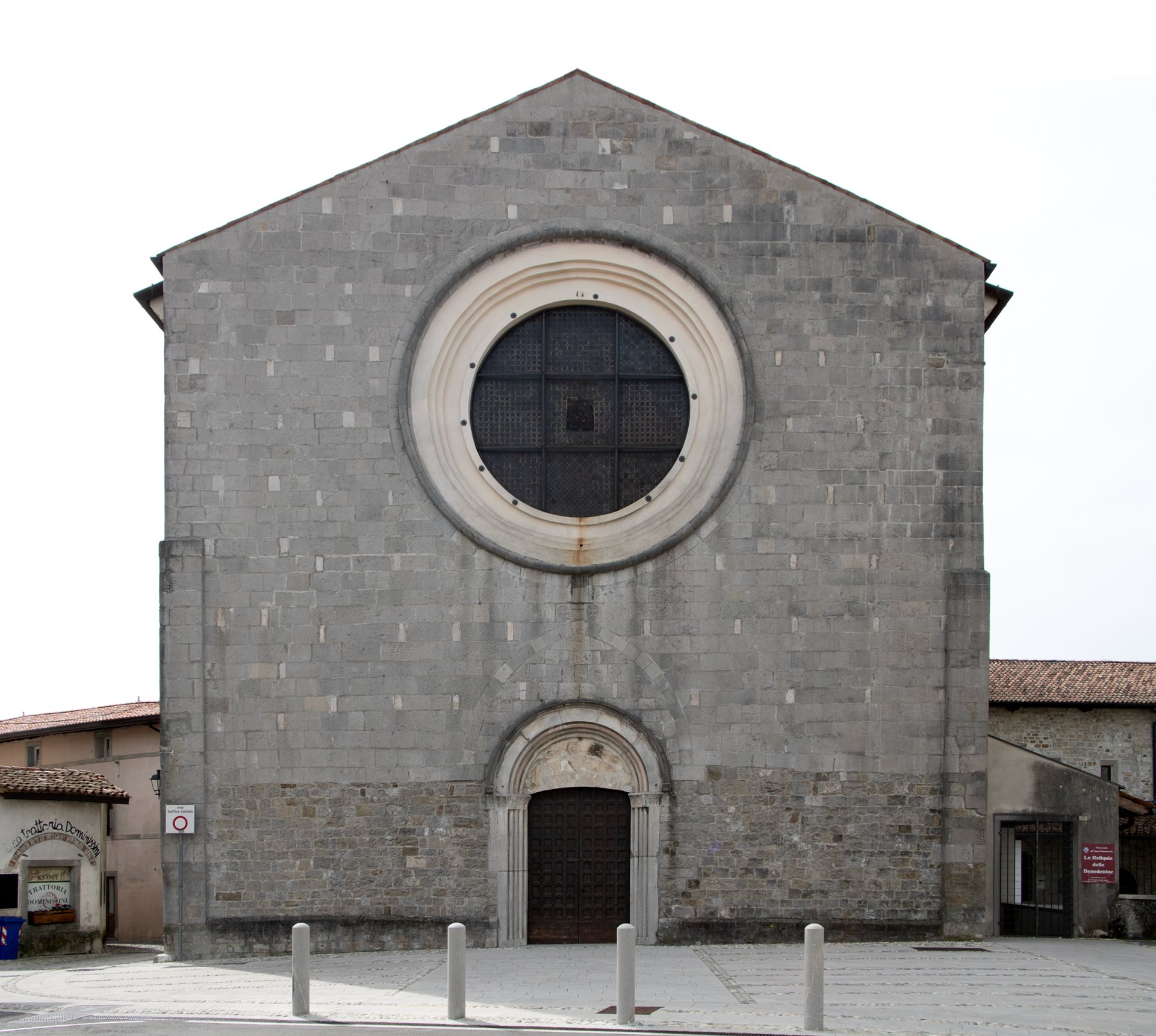 La copertura della chiesa è a doppia falda, con struttura in legno e manto in coppi; la facciata è liscia, in conci di pietra a vista, definita dal portale d’ingresso (a tutto sesto, con lunetta forse un tempo affrescata), e da un grane oculo centrale con cornice modanata. Sopra al portale è visibile la sagoma di un arco a sesto acuto, con stemmi e simboli sacri collocati sulla chiave di volta. All’interno un’unica navata centrale, con tre cappelle absidali e lacerti di affreschi realizzati da maestranze toscane e venete tra i secoli XIV e XVI. La sacrestia, inglobata nella struttura del convento assieme al chiostro, è decorata con affreschi di Giulio Quaglio (1693) e stucchi del Rietti.