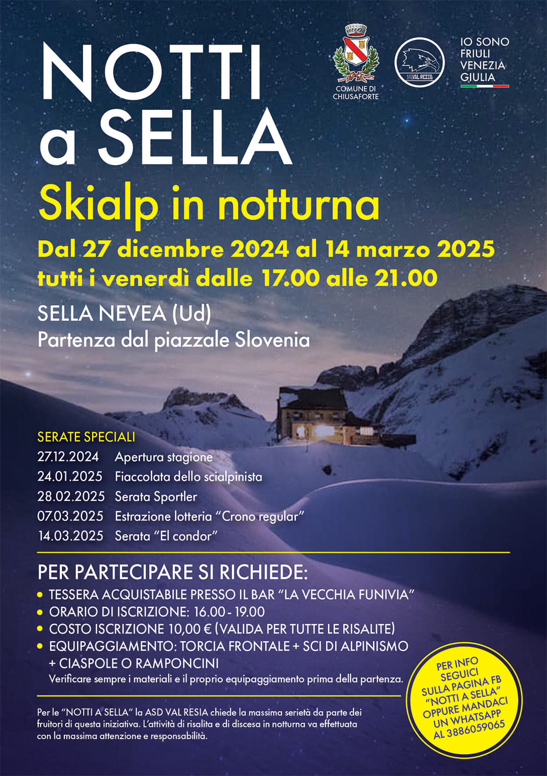 Per le "NOTTI A SELLA" la ASD Val Resia chiede la massima serietà da parte dei friutori di questa iniziativa. L'attività di risalita e di discesa in notturna va effettuato con la massima attenzione e responsabilità.