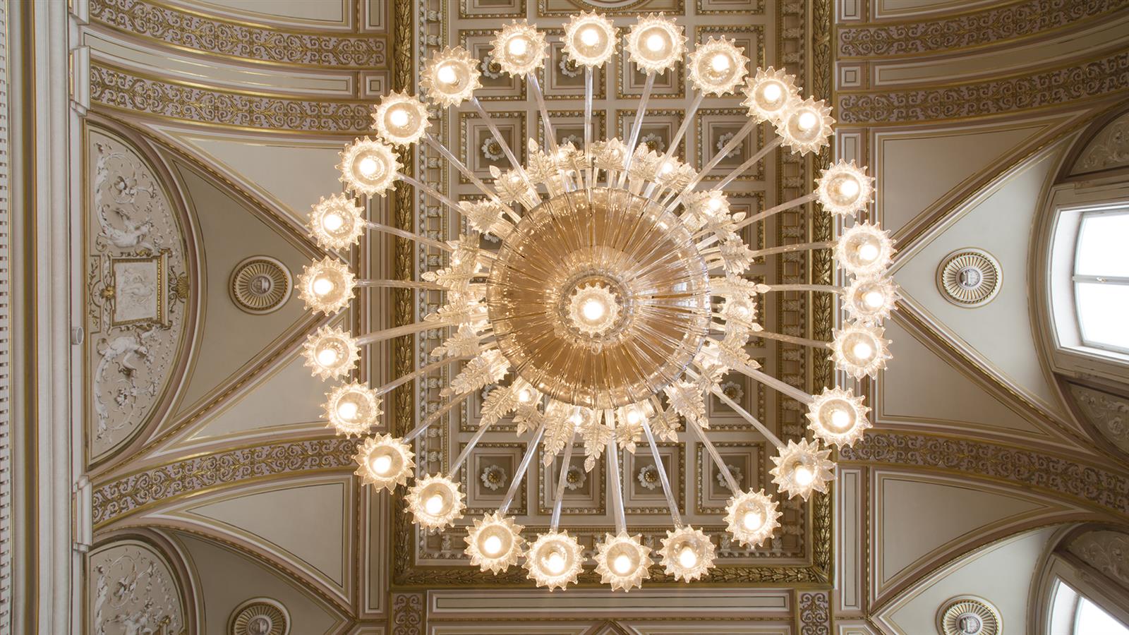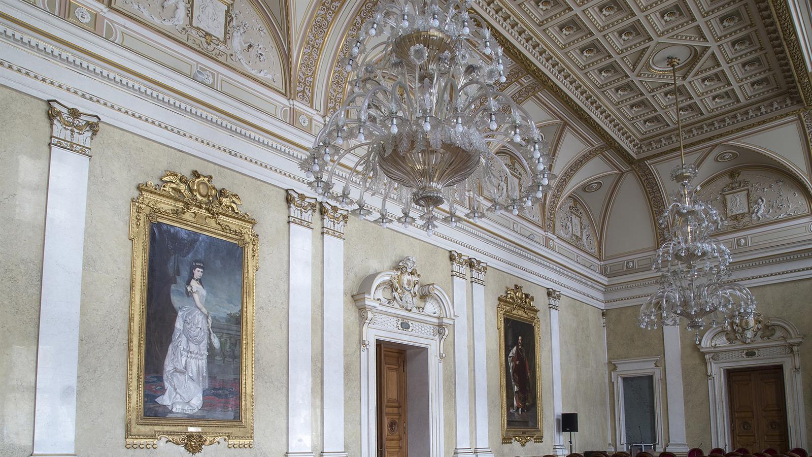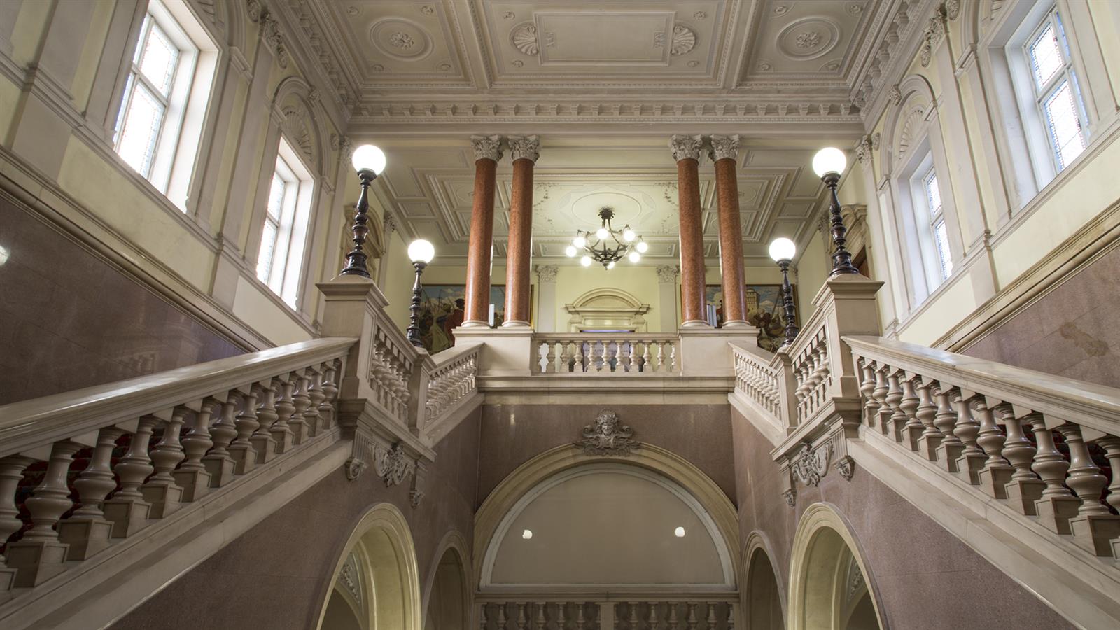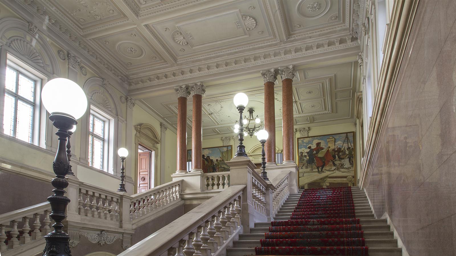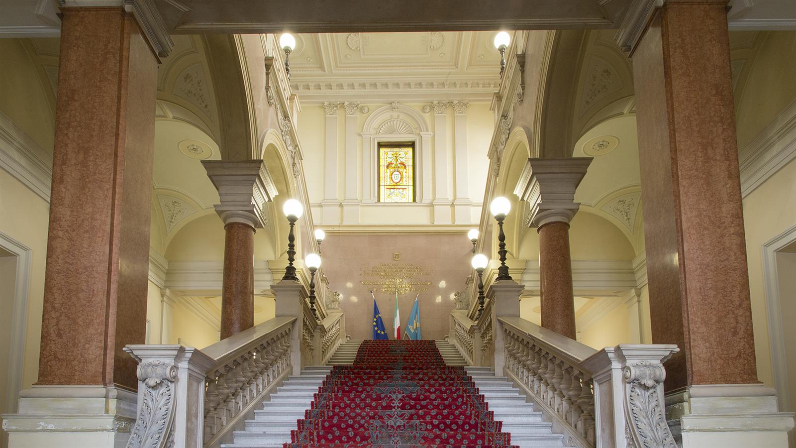 Two large marble sculptures, depicting Intelligence and Work, signed respectively by Ivan Rendic and Francesco Pezzicar, adorn the lobby of the main entrance. Inside, the following features are absolutely worth mentioning; the monumental carsian stone staircase, the chandeliers by Albert Milde and the beautiful hall for meetings and parties, where one can find two large portraits of Emperor Franz Joseph and Empress Elisabeth as well as two precious Murano glass chandeliers hanging from a beautiful coffered ceiling. The walls and ceilings of the rooms and halls are embelished with fine stucco decorations by A. Pelolli from Trieste.